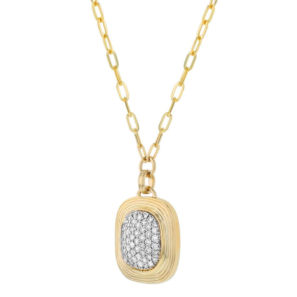 14K yellow gold pave necklace set with 1.0 carat round brilliant diamonds on paperclip chain in rounded rectangular shape. Price includes chain.
