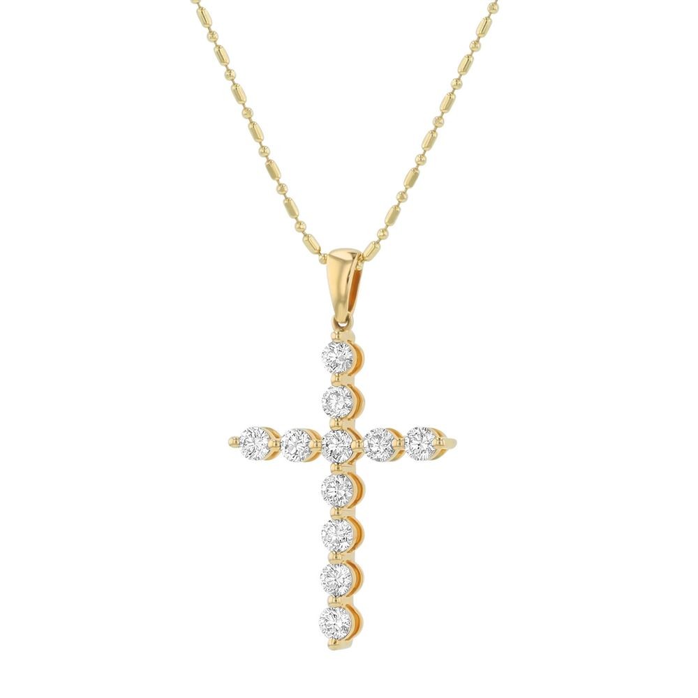 14K yellow gold shared prongs cross pendant set with 1.0 carat round brilliant diamonds. Chain sold separately.