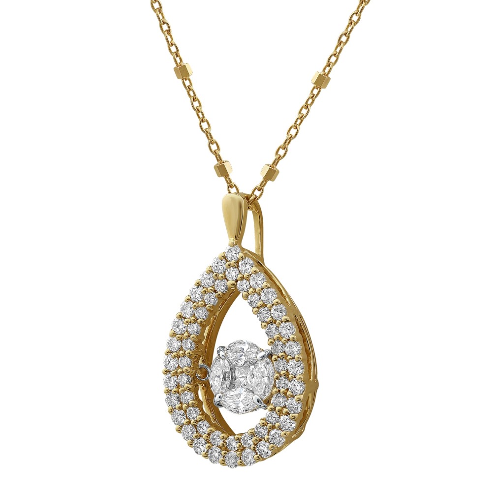 14K yellow gold pear shaped necklace set with 1.00 carat Diamonds. The Dancing center features 0.32 carat marquise and princess fusion set diamonds and the double halo is set with 0.68 carat round diamonds. Chain sold separately.