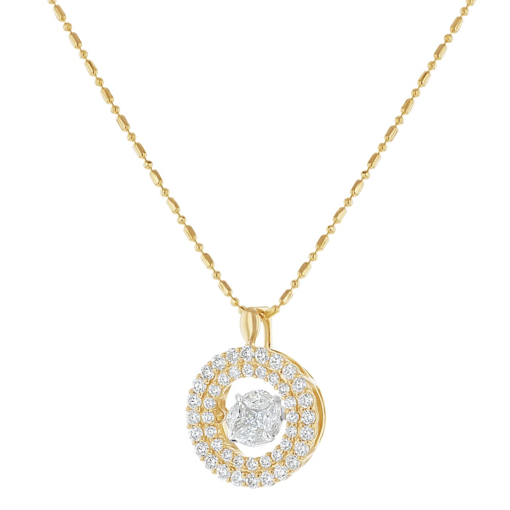 14K yellow gold round shape necklace set with 1.00 carat Diamonds. The Dancing center features 0.32 carat marquise and princess fusion set diamonds and the double halo is set with 0.68 carat round diamonds. Chain sold separately.