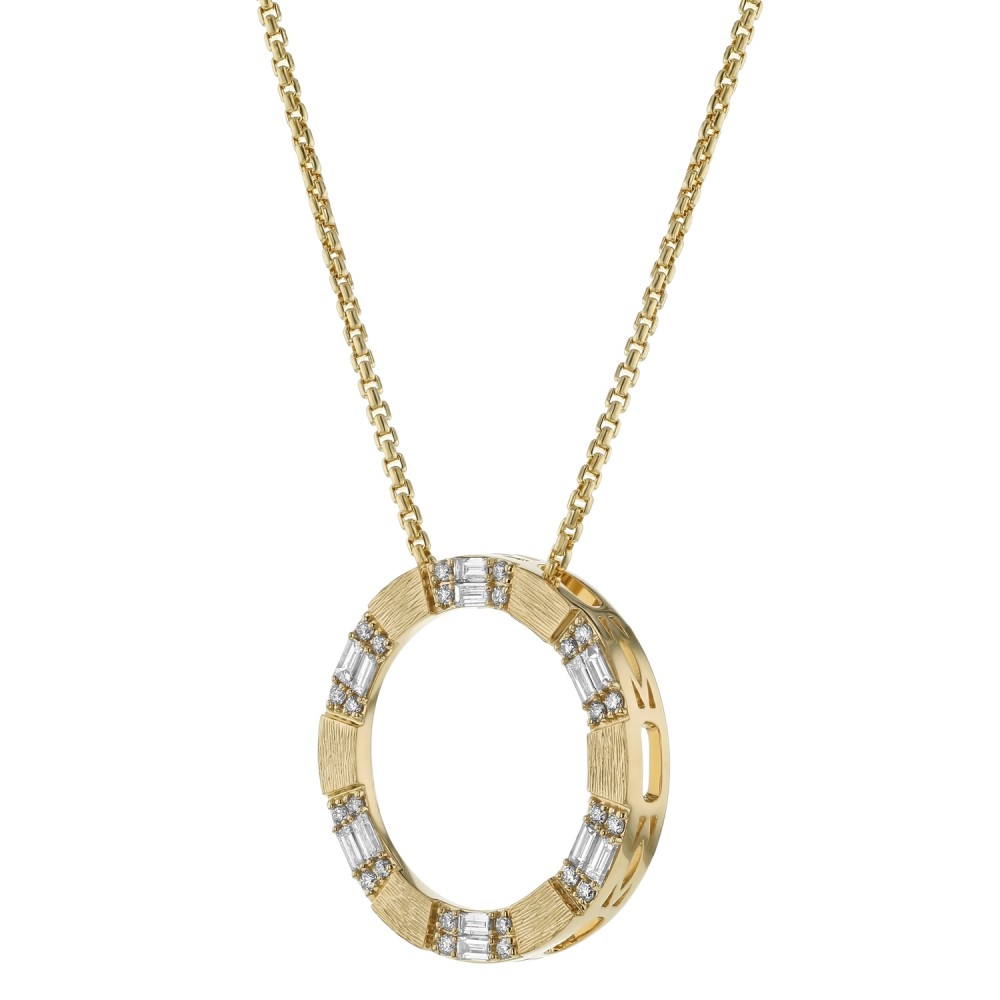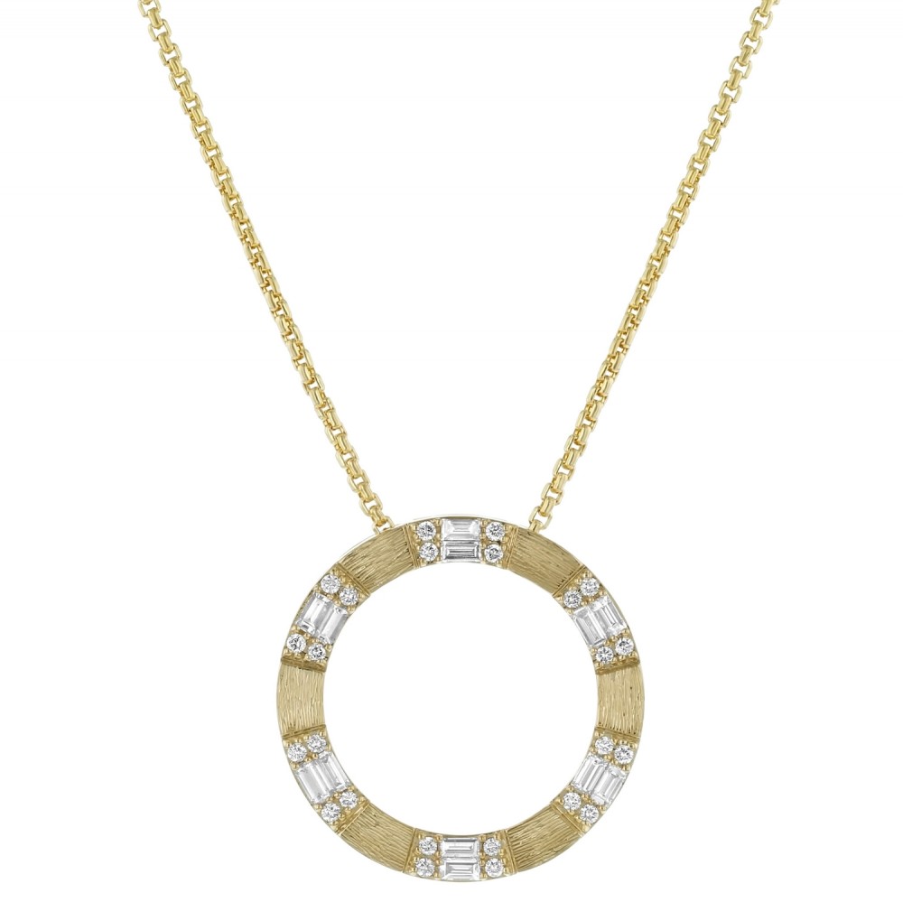 14K Yellow gold circle shape necklace set with 1.00 carat of fancy cut baguette and round diamonds and adorned with texture finish. Chain sold separately.