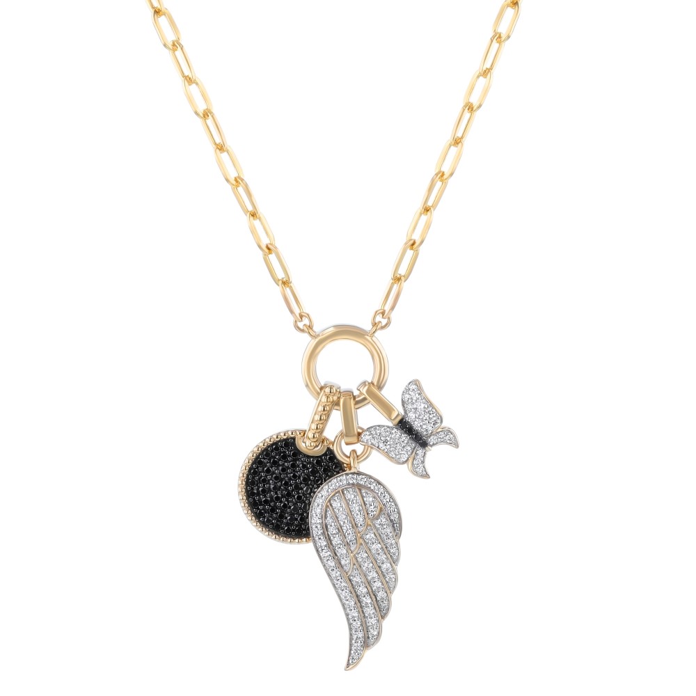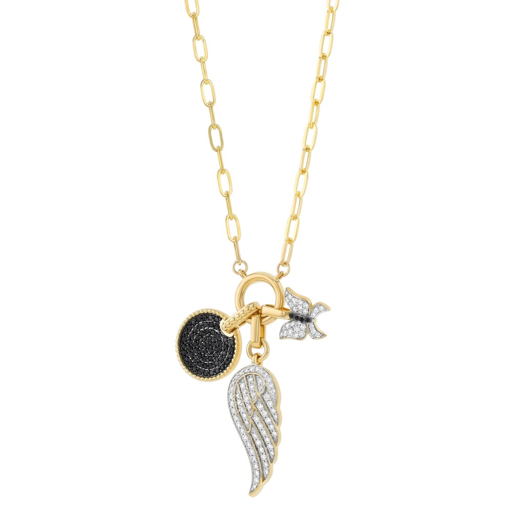 14K yellow gold butterfly, wing and disk charm necklace set with 1.00 carat round brilliant black and white diamonds. Price includes chain.