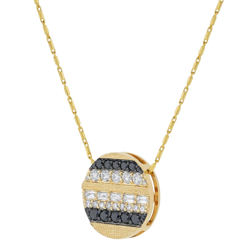 14K yellow gold pendant set with 0.40ct. round and 0.20ct. baguette white diamonds and 0.40ct. black round diamonds, total 1.00 carat. The pendant is texture finished. Chain sold separately.
