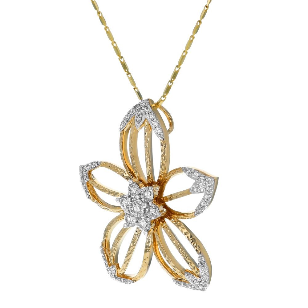 14K yellow gold pendant set with 1.00 carat white round brilliant diamonds in textured flower design. Chain sold separately.