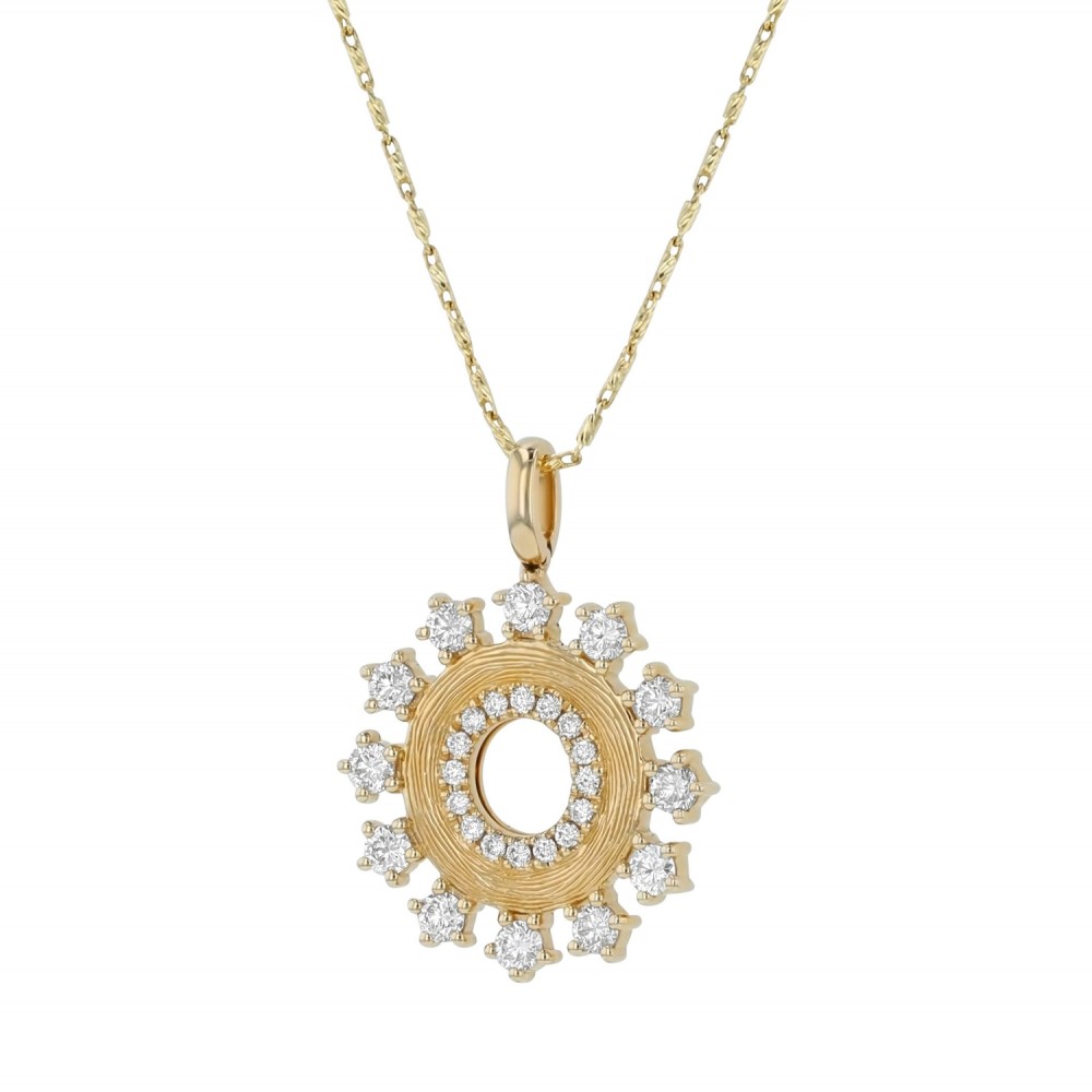 14K yellow gold oval bail pendant set with 1.00 carat round brilliant diamonds in textured finish. Chain sold separately.