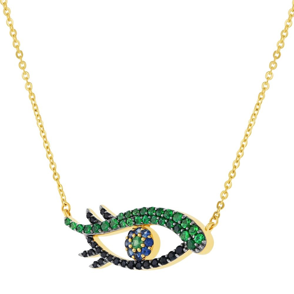 14K yellow gold EVIL EYE necklace set with 1.10 carat round brilliant cut blue sapphires, black sapphires and green tsavorites. Chain included.