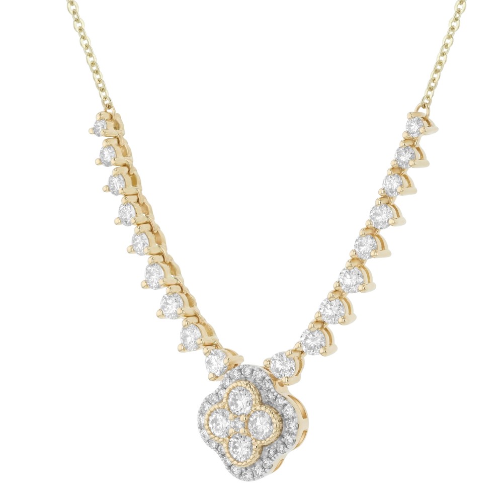 14K yellow gold clover shape necklace set with 1.60 carat round brilliant diamonds. Cable chain included.