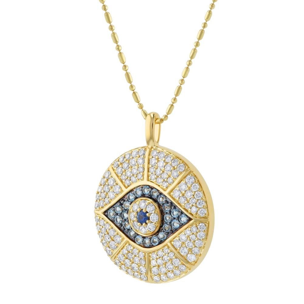 14K yellow gold EVIL EYE medallion necklace set with 1.25 carat round brilliant diamonds, 0.55 carat Swiss blue topaz and blue sapphire. The pendant is detailed with black rhodium. Chain sold separately.