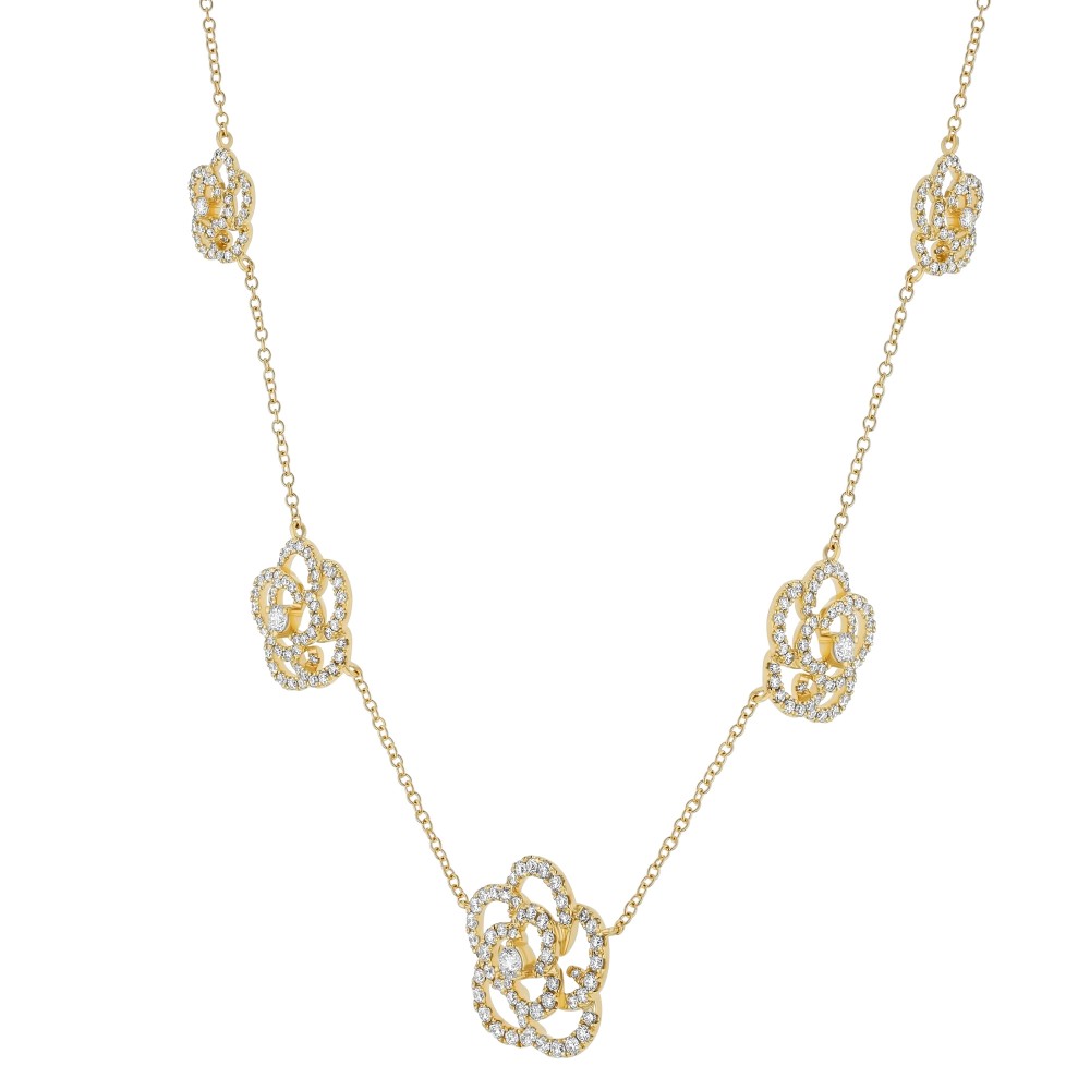 14K yellow gold 5 flowers necklace set with 2.15 carat round brilliant diamonds. Price includes chain.