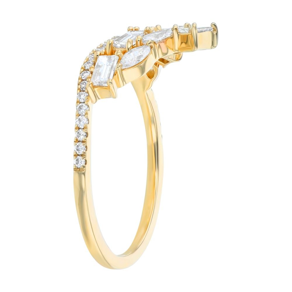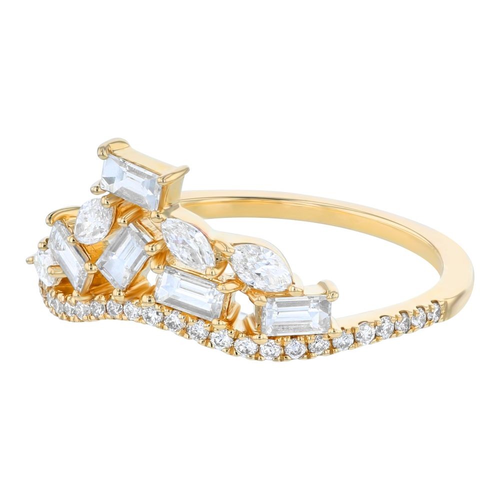 14K yellow gold ring set with 0.75 ct. baguette, marquise and round diamonds in tiara design. Excellent match to modern engagement rings. Part of our Crown Rings collection.