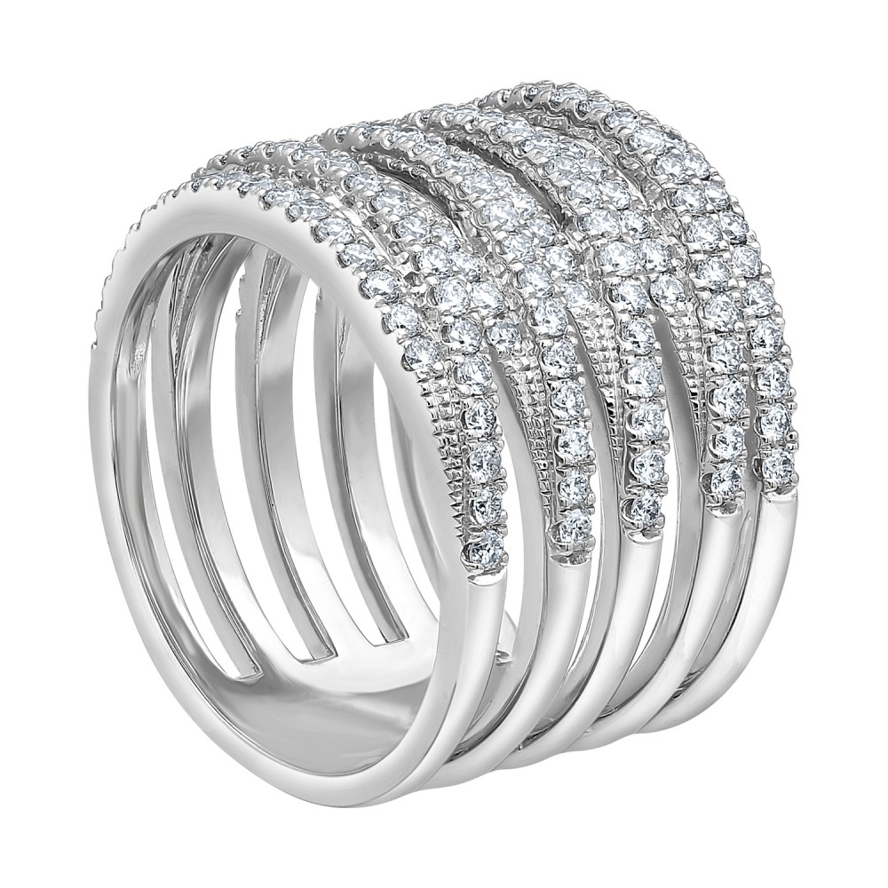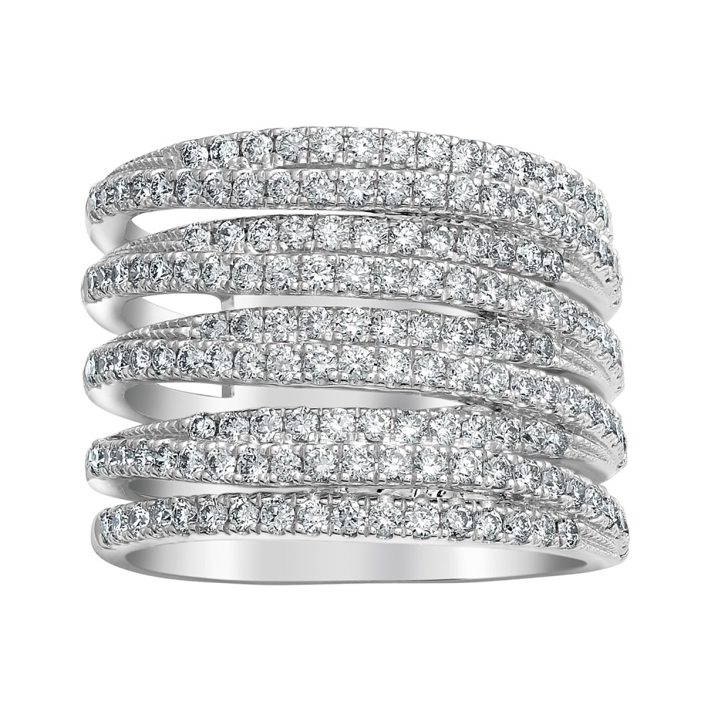 14K white gold multi row wide fashion ring set with 1.50 carat round brilliant diamonds and high polish finish.