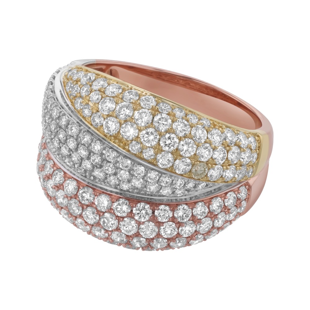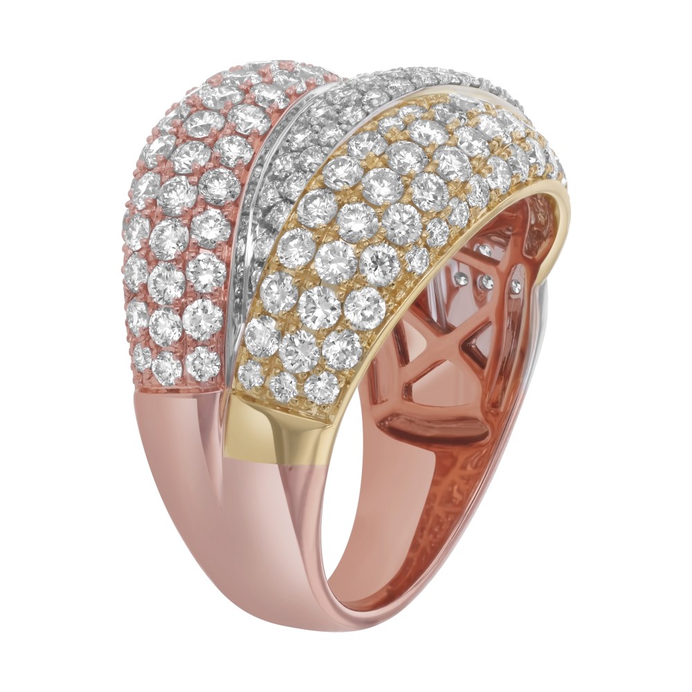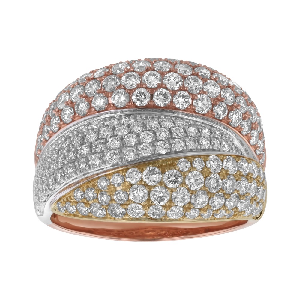 14K yellow, rose and white gold wide fashion ring set with 2.60 carat round brilliant diamonds and high polish finish.