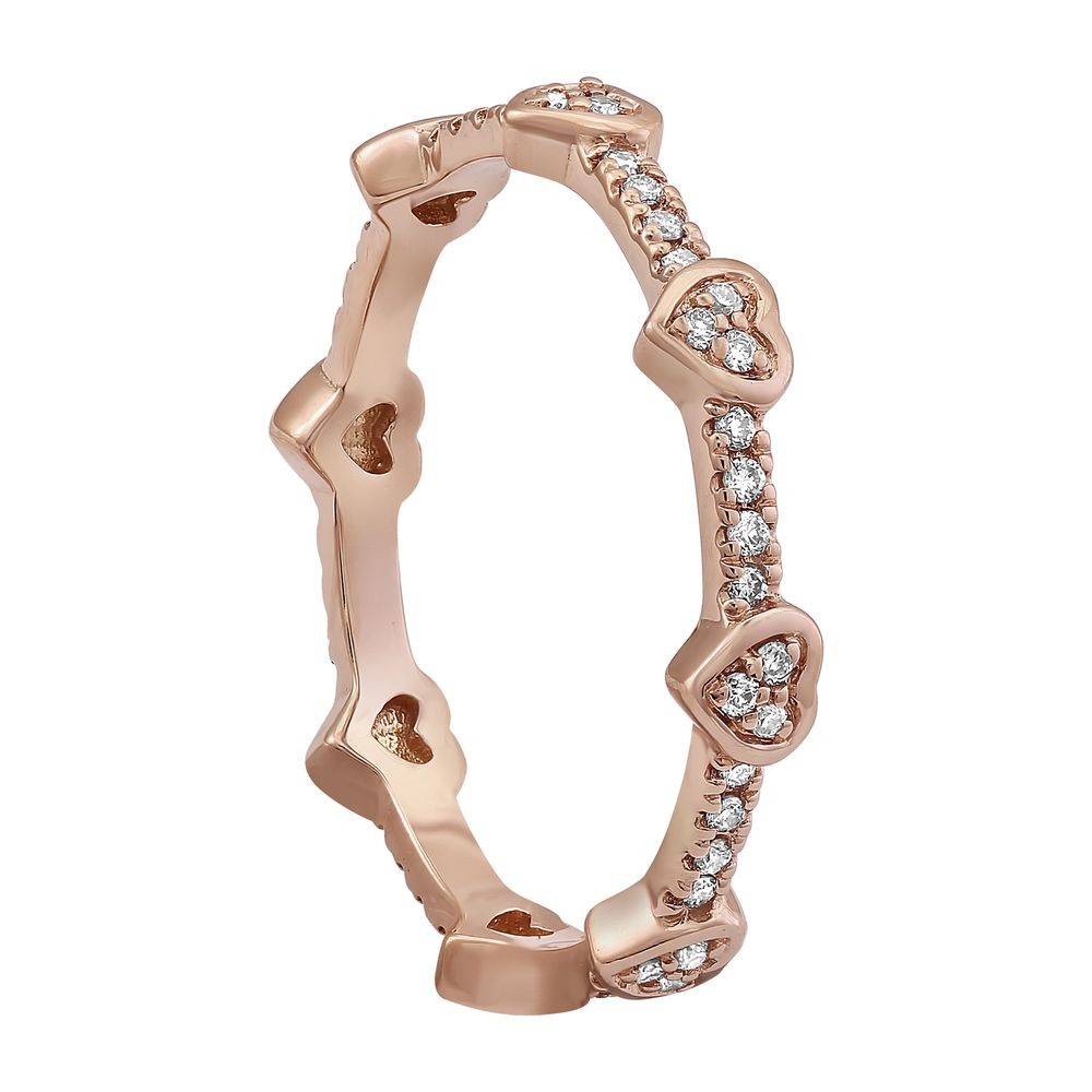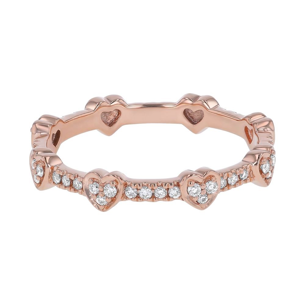 14K rose gold eternity band ring set with 0.20 ct. round diamonds. Heart shapes and polished detailing gives this dainty ring distinctive look. The diamonds are bead set all around the ring perimeter.