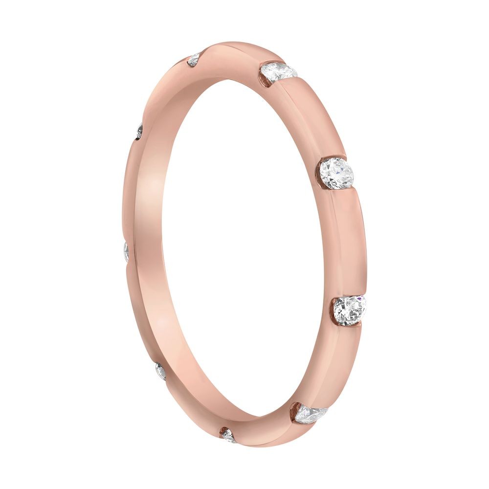 14K rose gold eternity band ring with 0.25 ct. round diamonds. The diamonds are tension set all around the ring perimeter.