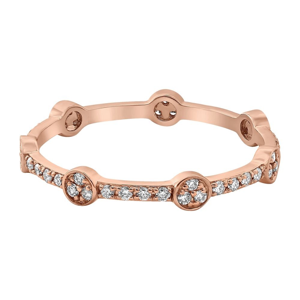 14K rose gold eternity band ring with 0.25 ct. round diamonds. The diamonds are tension set all around the ring perimeter.