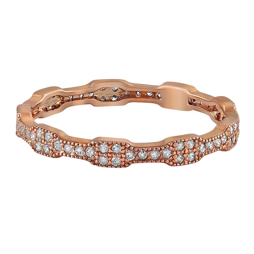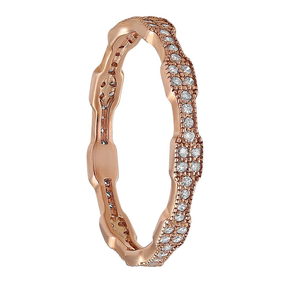 14K rose gold eternity band ring set with 0.25 ct. round diamonds. The ring has a distinctive design that enable it to stack easy with each other. The diamonds are bead set all around the ring perimeter.