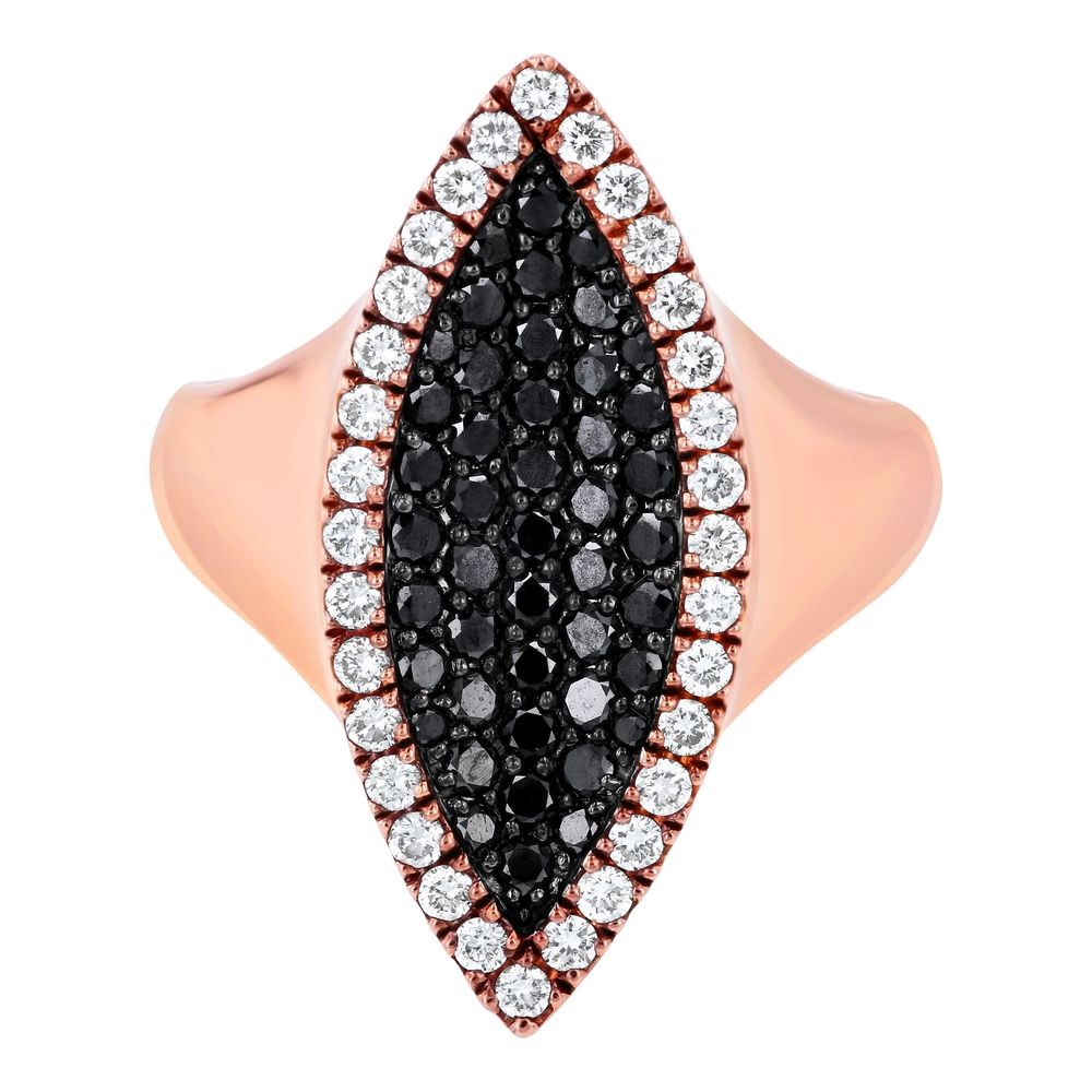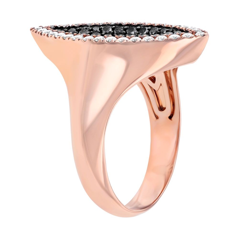 14K rose gold geometric ring set with 0.4 carat white and 0.6 carat black round brilliant diamonds in marquise design.