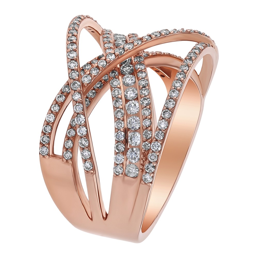 14K rose gold multi row crossover fashion ring set with 1.00 carat round brilliant diamonds and high polish finish.