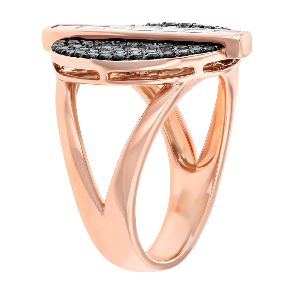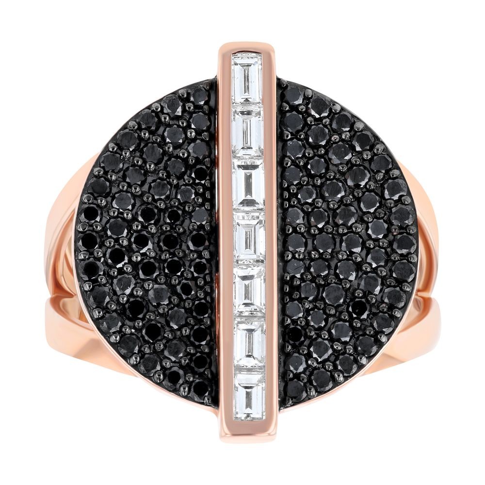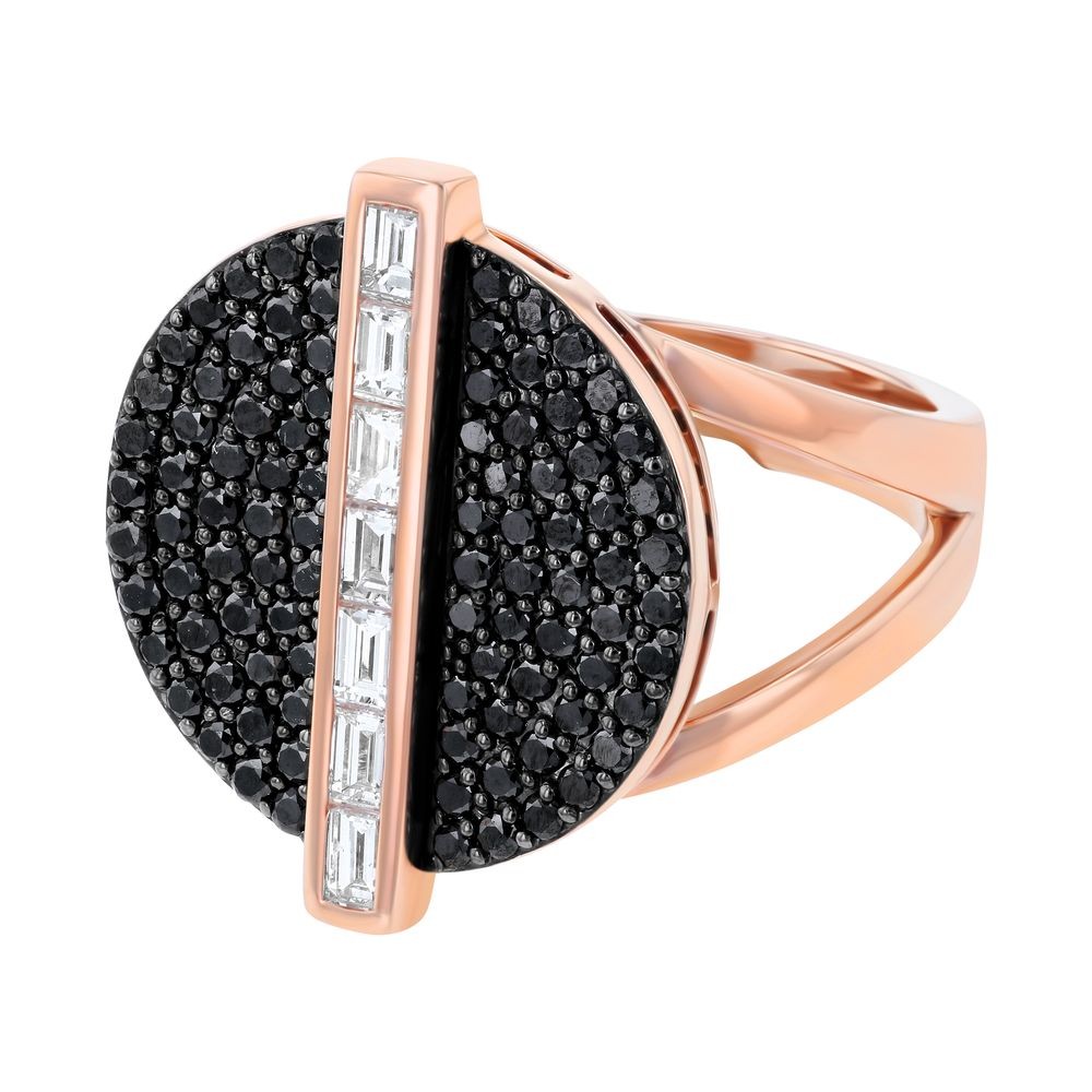 14K rose gold geometric ring set with 0.5 carat white baguette diamonds and 0.9 carat black round brilliant diamonds in round design.