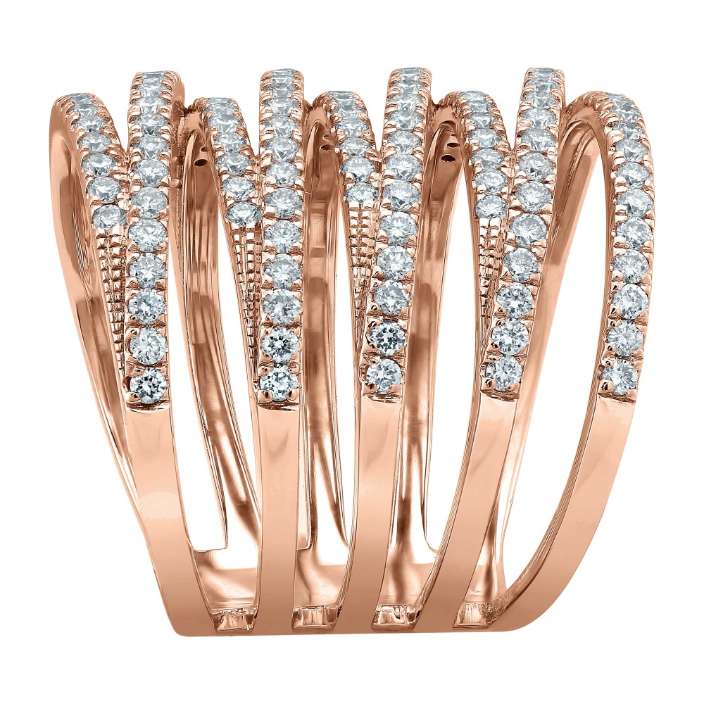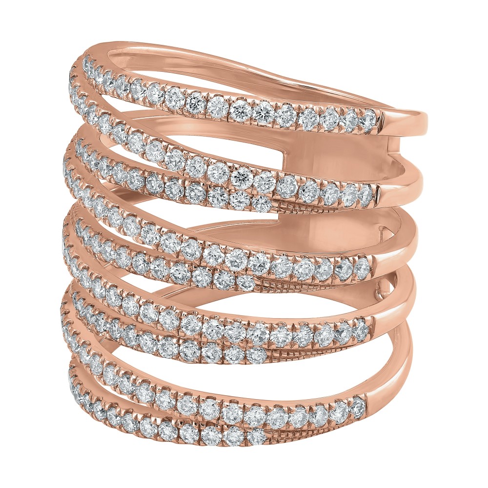 14K rose gold multi row wide ring set with 1.50 ct. round brilliant diamonds.
