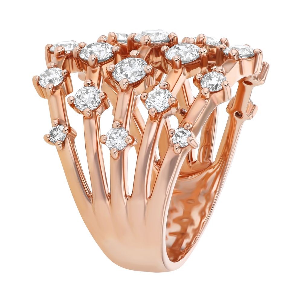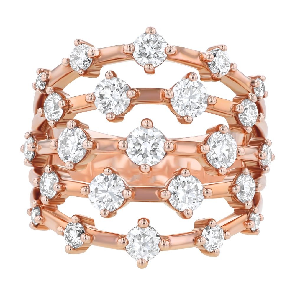 14K rose gold multi-rows ring set with 2.0 ct. white round diamonds and detailed with high polish finish.