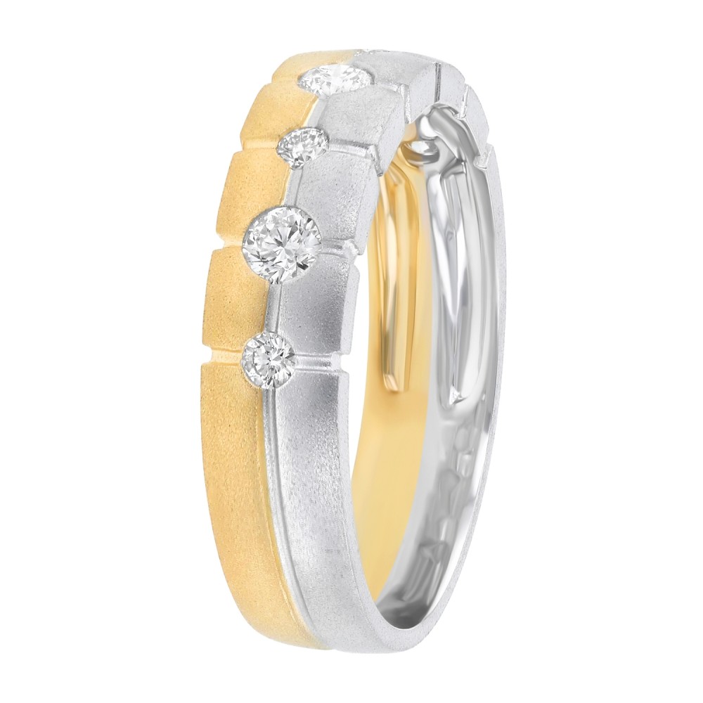 14K two tone yellow and white gold band ring set with 0.45 carat round white brilliant diamond in satin finish.