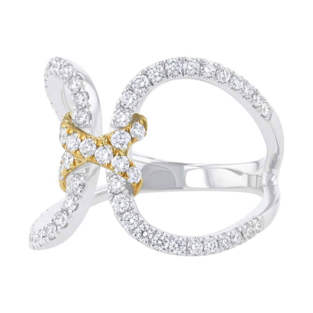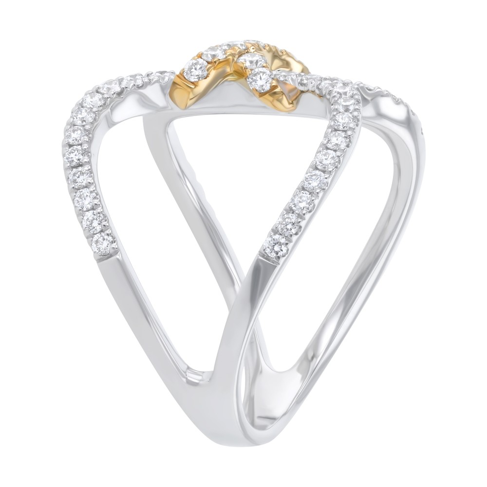 14K yellow and white gold heart shape knot ring set with 0.70 carats round diamonds.