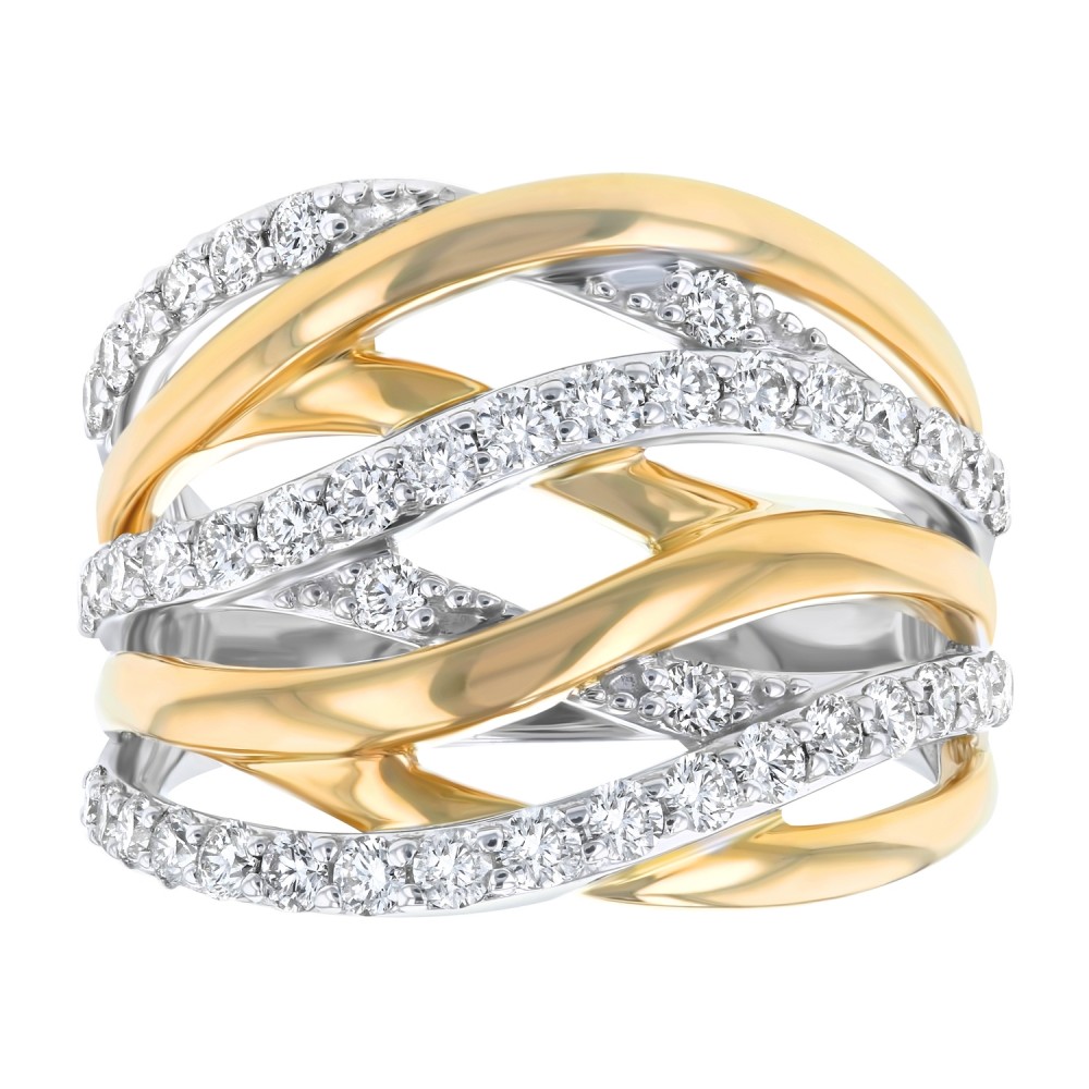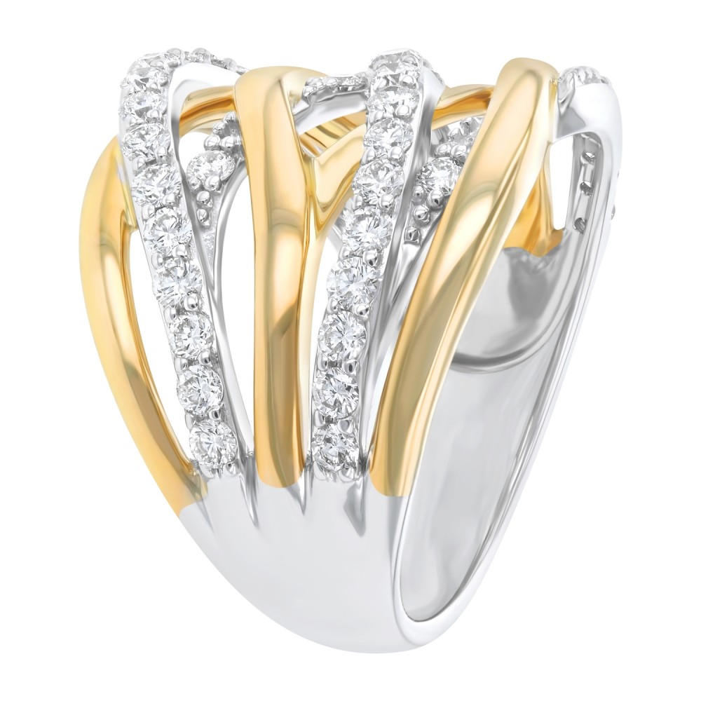 14K two tone yellow and white gold geometric ring set with 1.00 carat round brilliant diamonds and high polish finish.