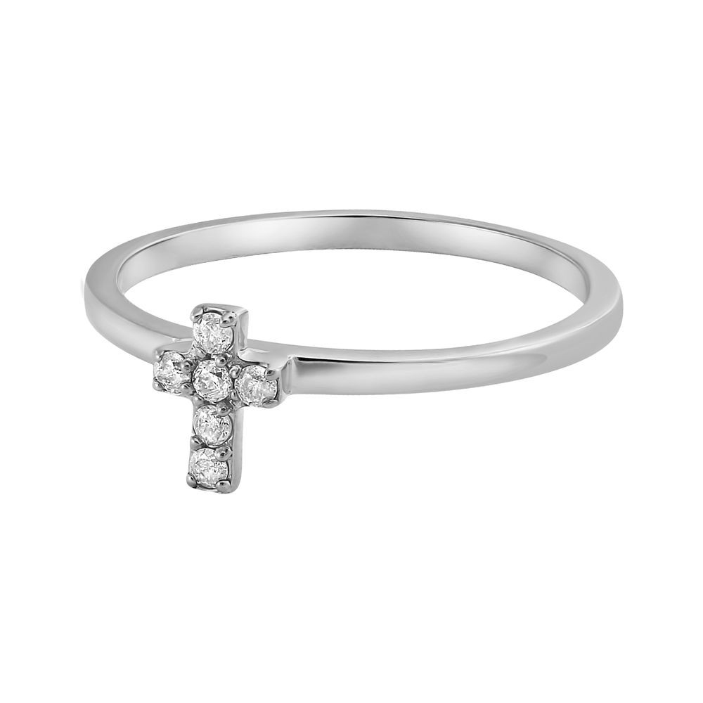14K white gold semi-eternity dainty cross band ring with 0.10 ct. round diamonds.
