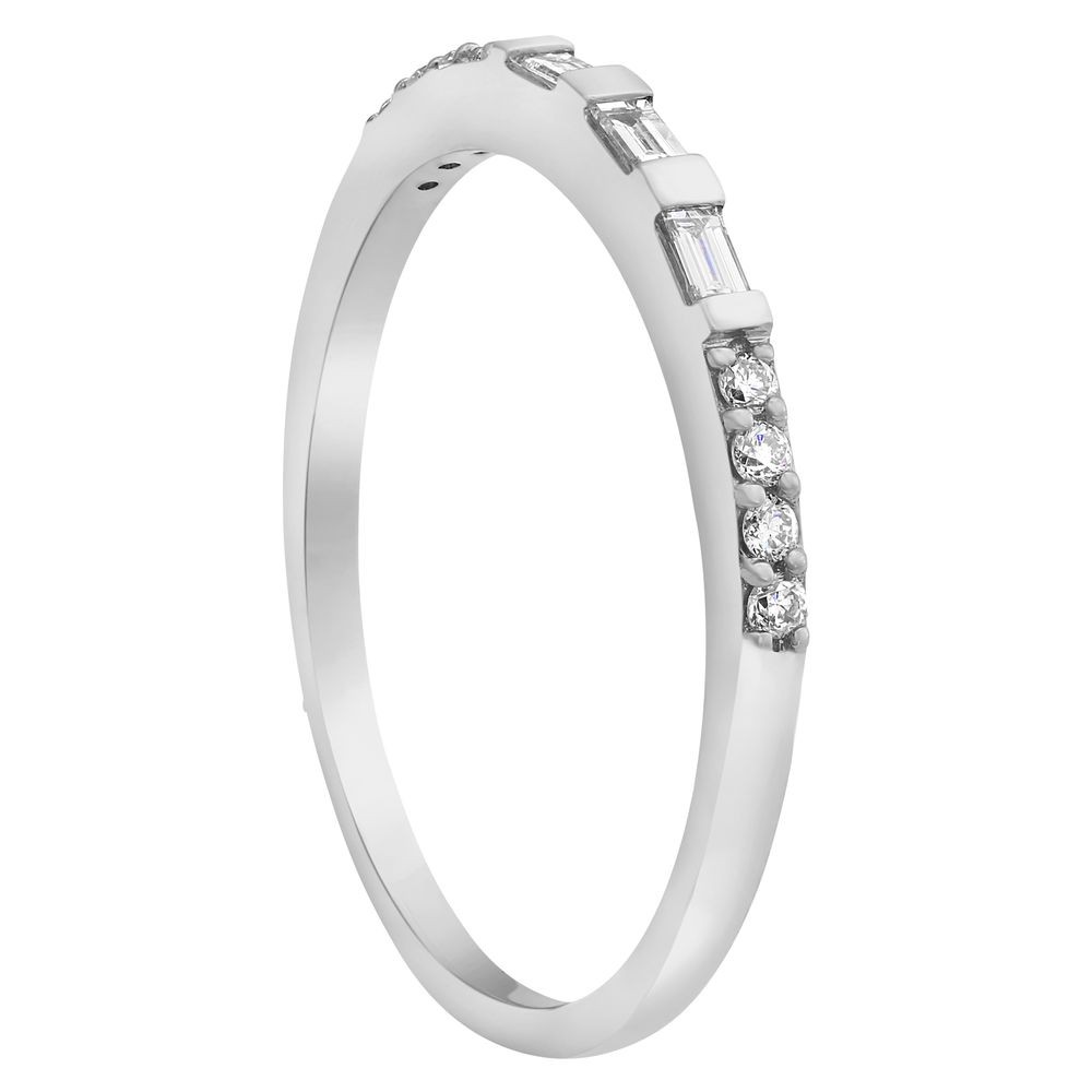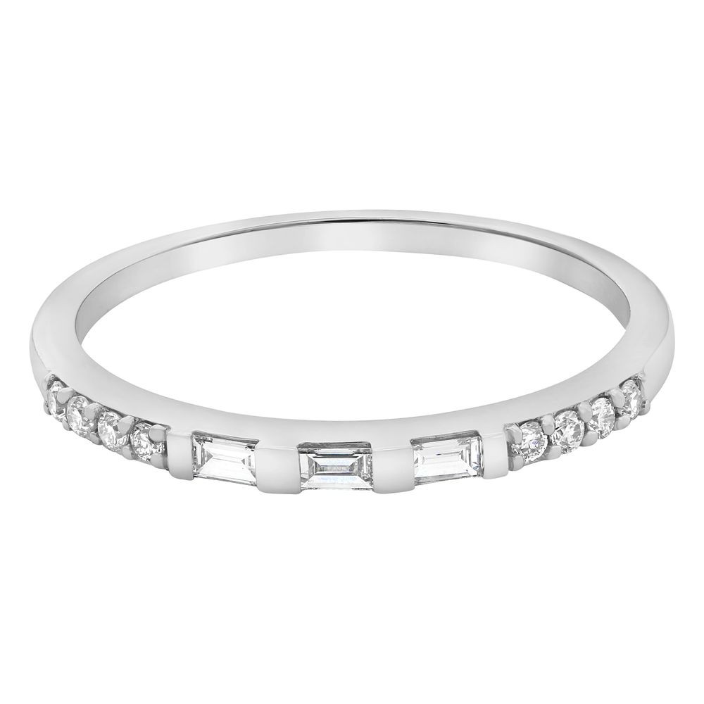 14K white gold semi-eternity band ring set with 0.16 ct. baguette and round diamonds.