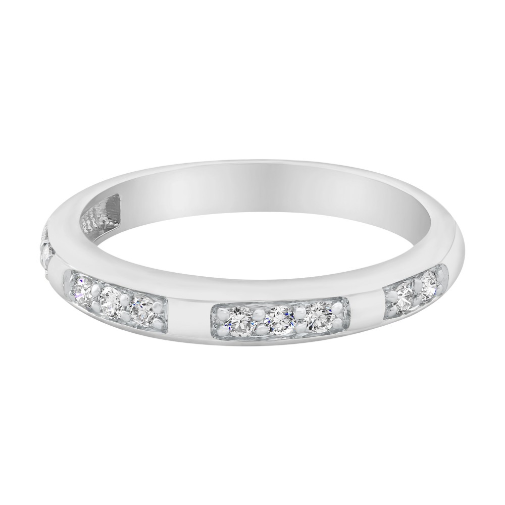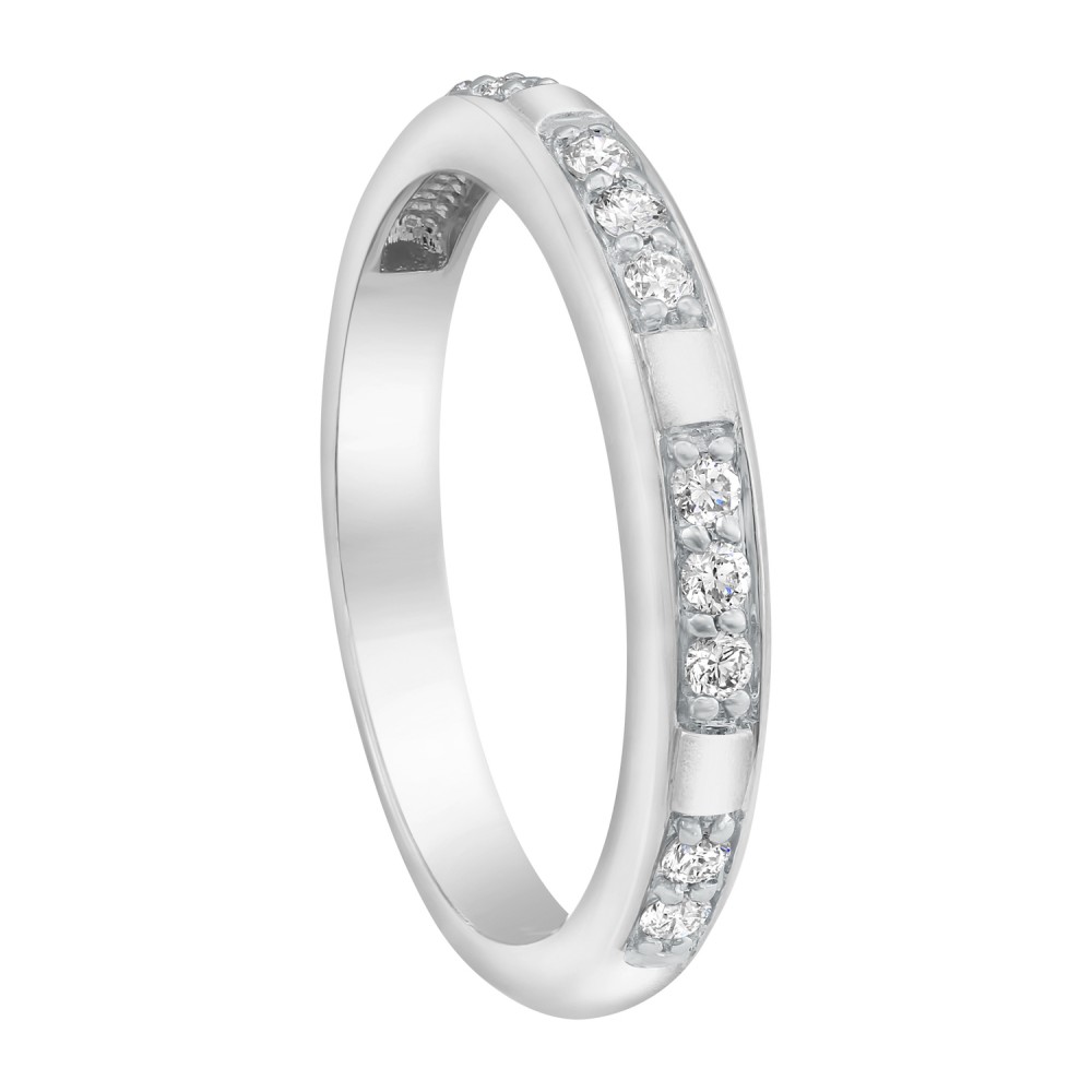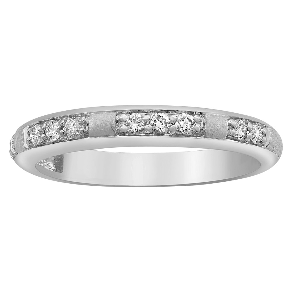 14K white gold semi eternity band ring set with 0.20 ct. round brilliant diamonds and satin finish.