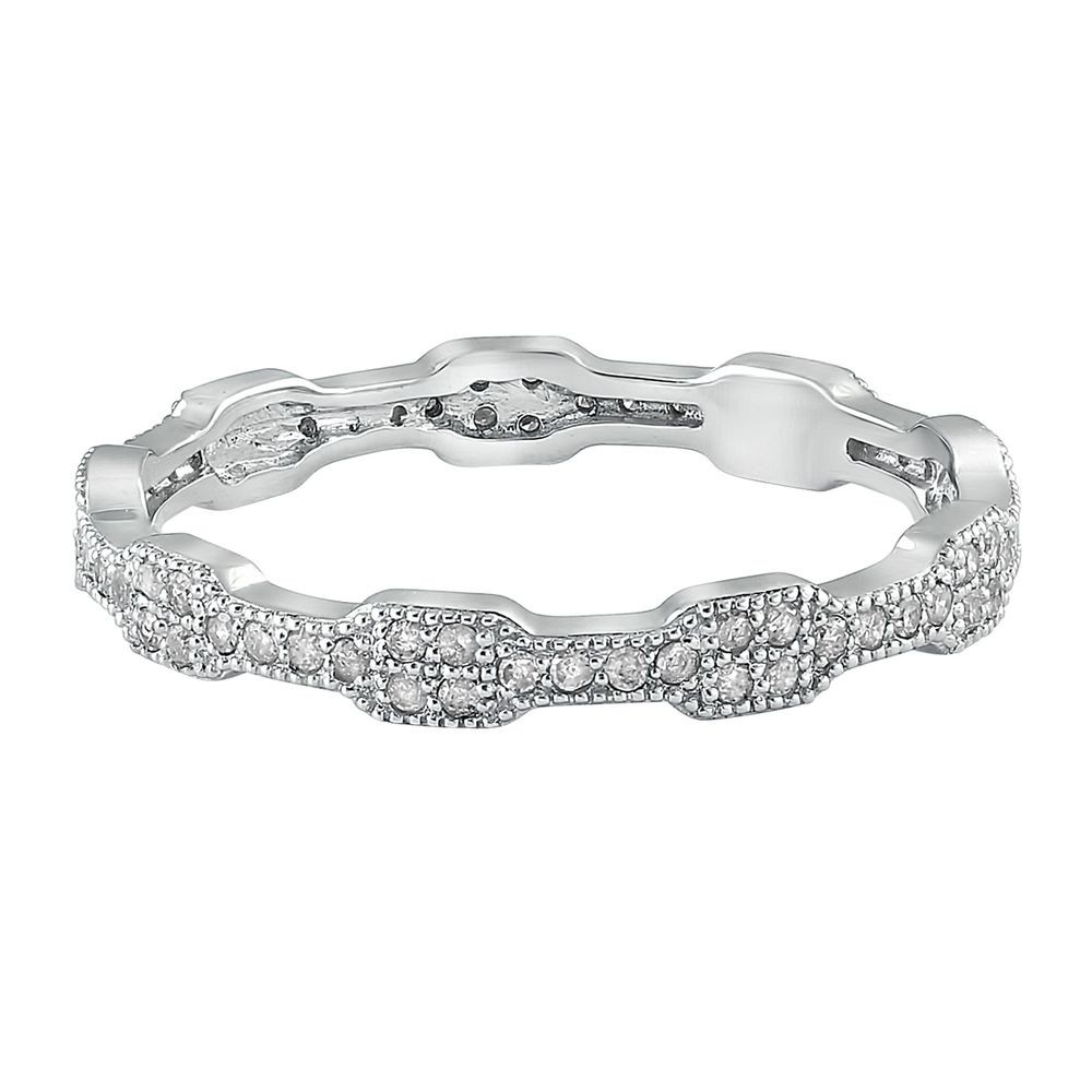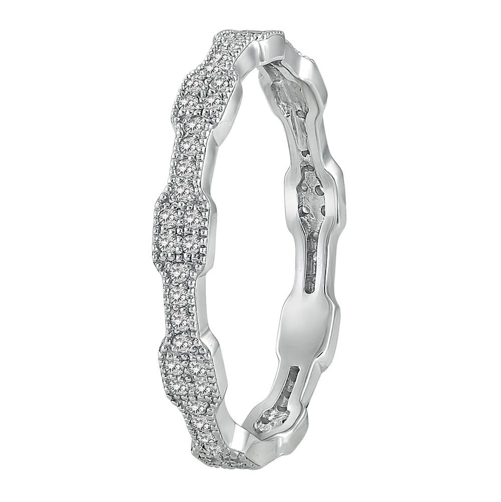 14K white gold eternity band ring set with 0.25 ct. round diamonds. The ring has a distinctive design that enable it to stack easy with each other. The diamonds are bead set all around the ring perimeter.