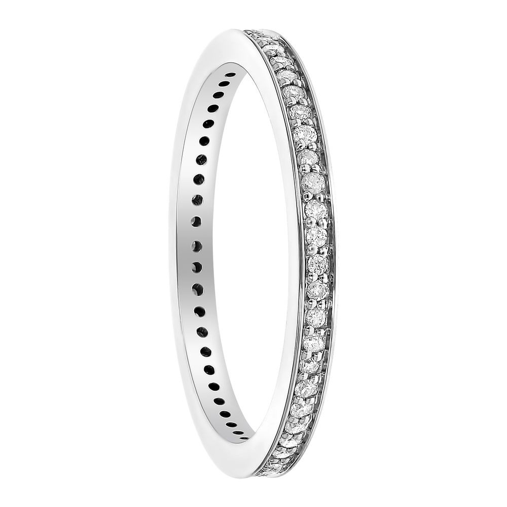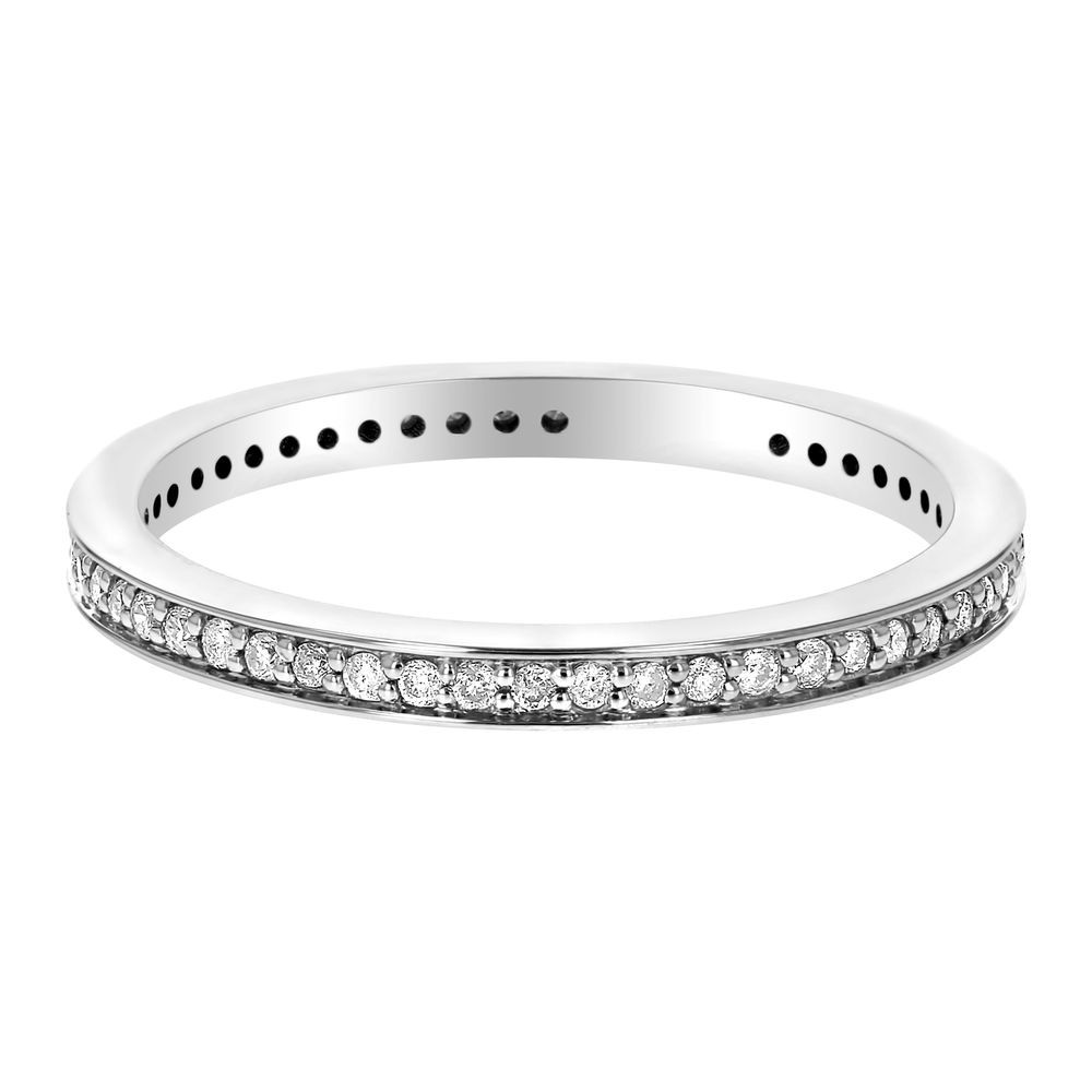 14K white gold eternity band ring set with 0.25 ct. round diamonds. The ring features a classic design with milgrain detailing. The diamonds are bead set all around the ring perimeter.