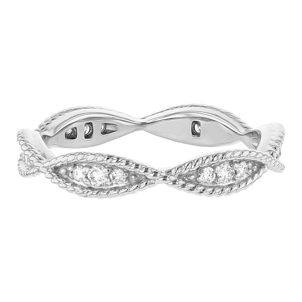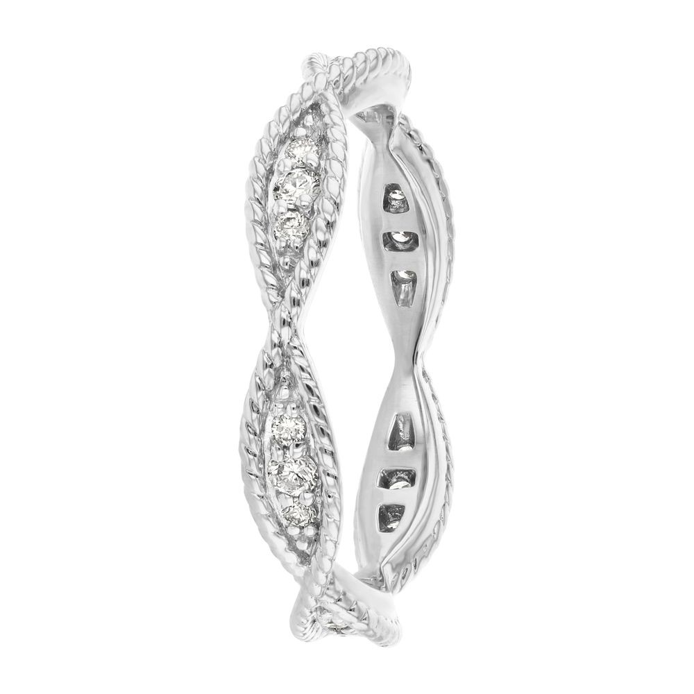 14K white gold eternity band ring set with 0.25 ct. round diamonds. The ring milgrain detailing showcase vintage inspired distinctive infinity design. The diamonds are bead set all around the ring perimeter.