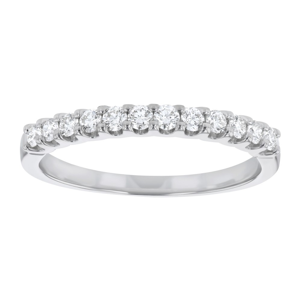 14K white gold semi eternity wedding band ring shared prongs set with 0.30 ct. round cut brilliant white diamonds and high polish finish.