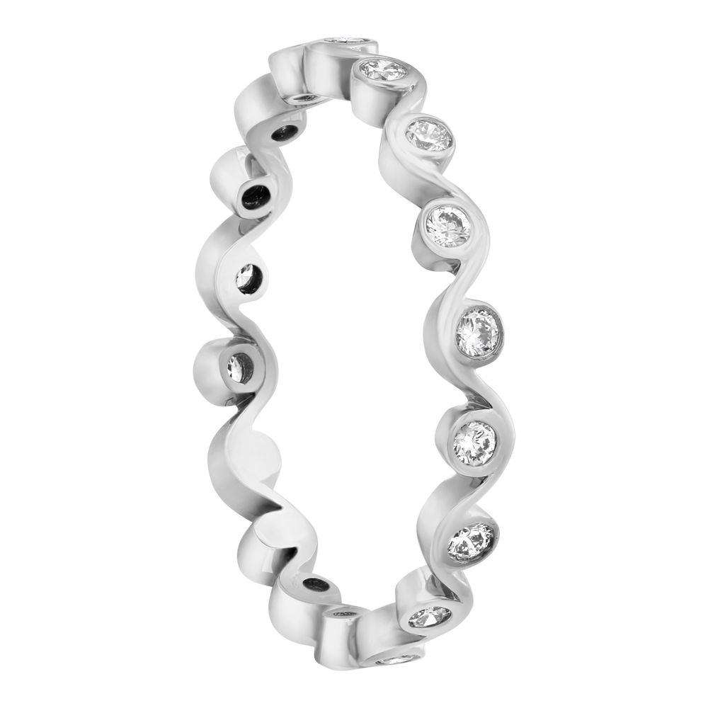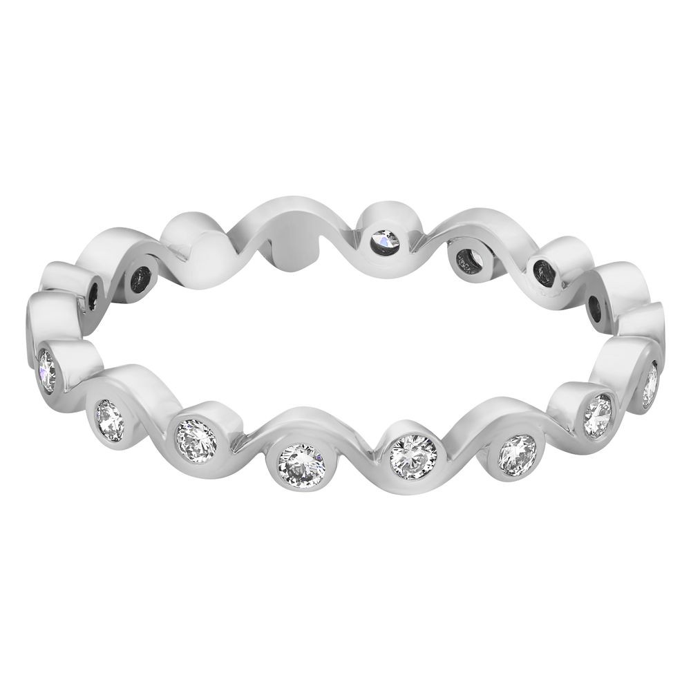 14K white gold eternity band ring set with 0.33 ct. round diamonds. The ring showcase bubble style distinctive design. The diamonds are bezel set all around the ring perimeter.