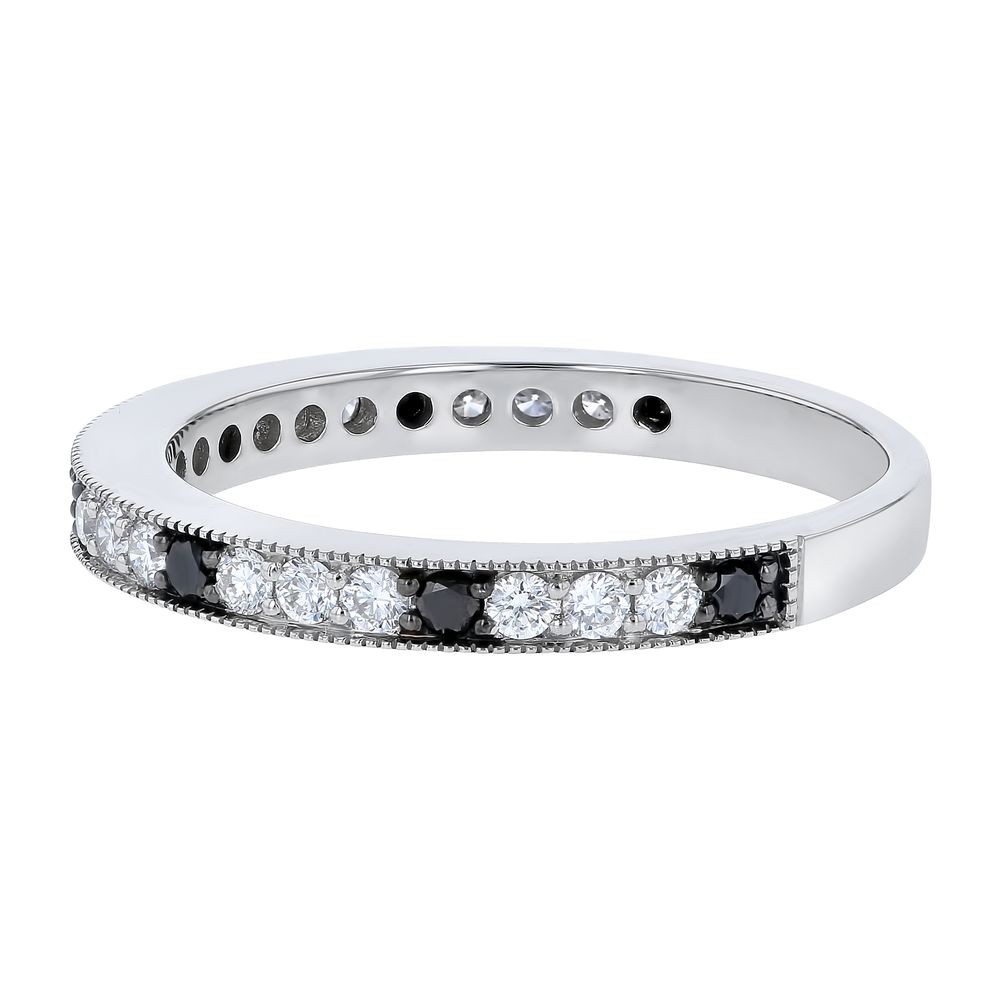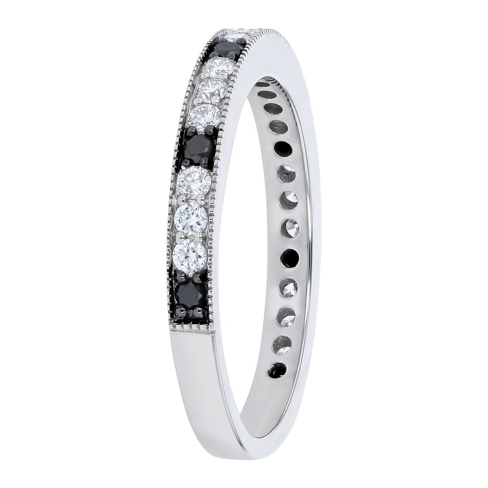 14K white gold semi-eternity band ring set with 0.45 ct. round black and white diamonds.