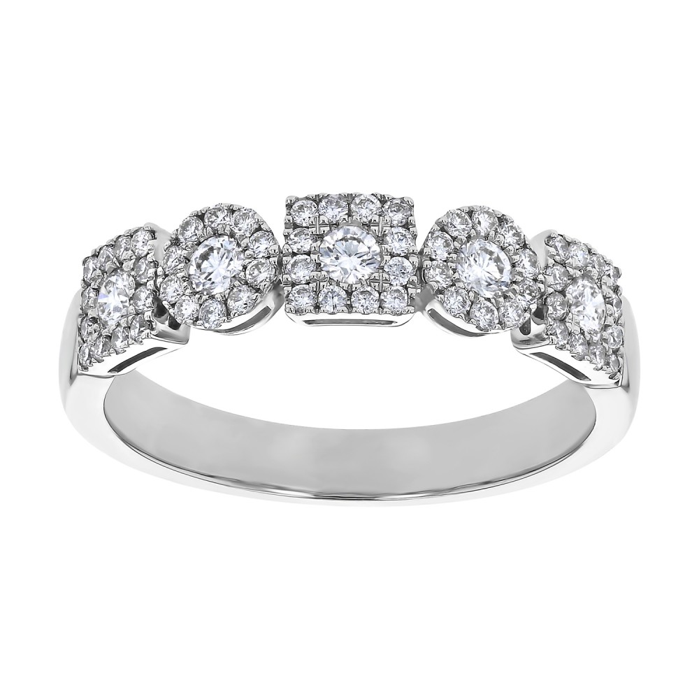 14K white gold semi eternity band ring set with 0.50 ct. round cut brilliant white diamonds in geometric patterns and high polish finish.