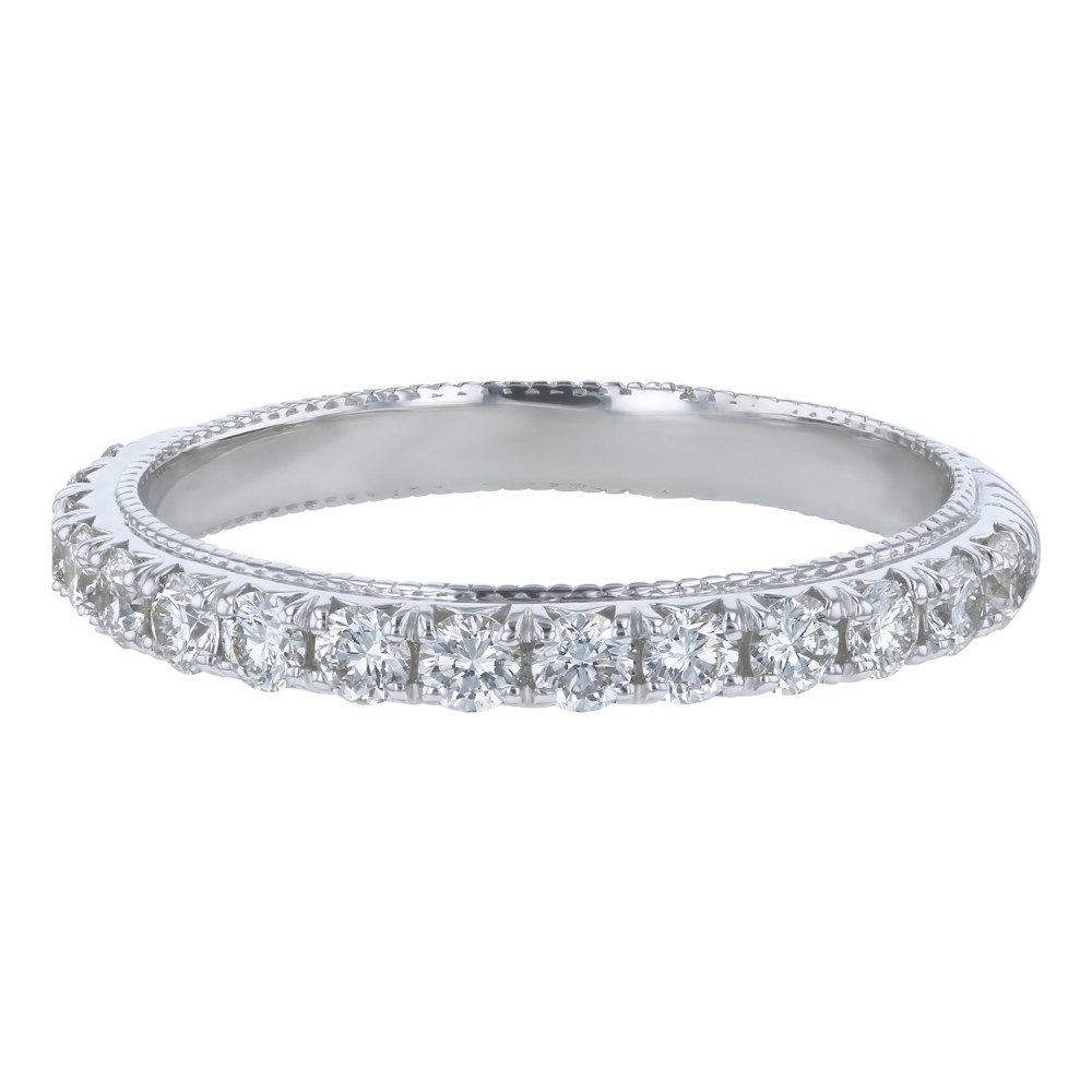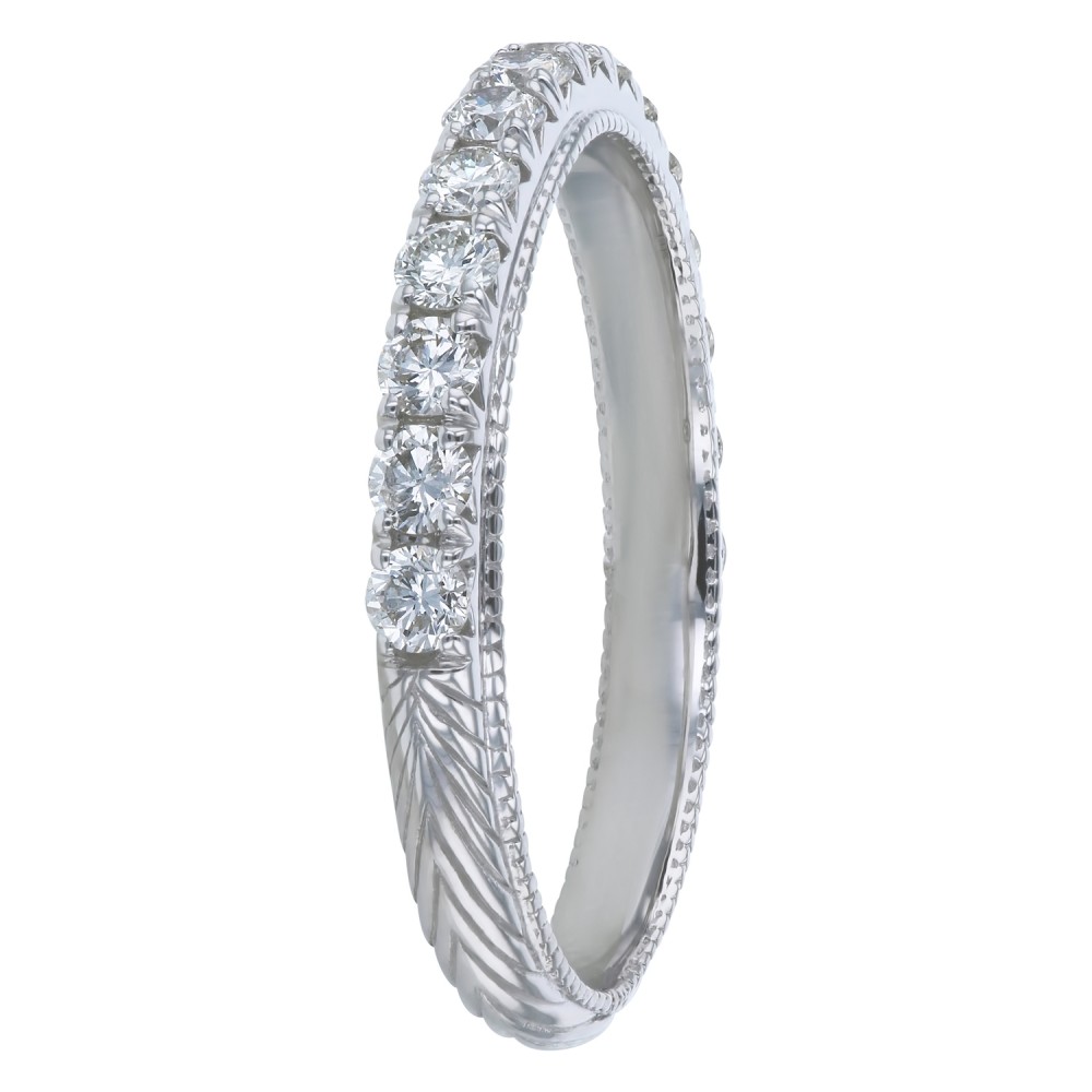 14K white gold semi eternity wedding band ring shared prongs set with 0.50 ct. round cut brilliant white diamonds, side and shank engraved and high polish finish.