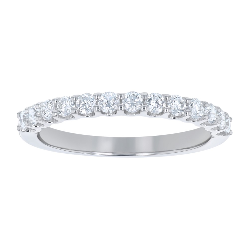 14K white gold semi eternity wedding band ring shared prongs set with 0.50 ct. round cut brilliant white diamonds and high polish finish.