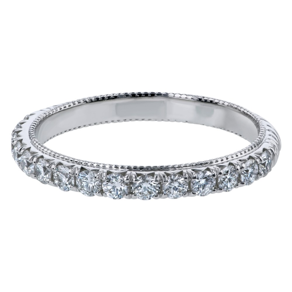 14K white gold semi eternity wedding band ring shared prongs set with 0.70 ct. round cut brilliant white diamonds, side and shank engraved and high polish finish.