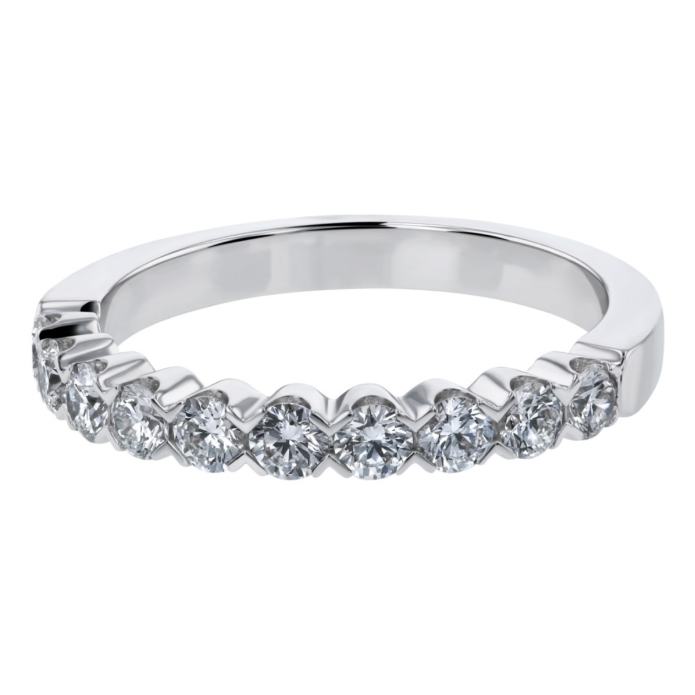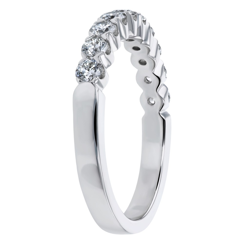 14K white gold semi eternity wedding band ring shared prongs set with 0.70 ct. round cut brilliant white diamonds and high polish finish.