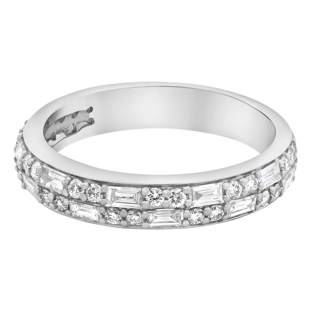 14K white gold semi eternity band ring set with 0.85 ct. baguette and round brilliant white diamonds and high polish finish.