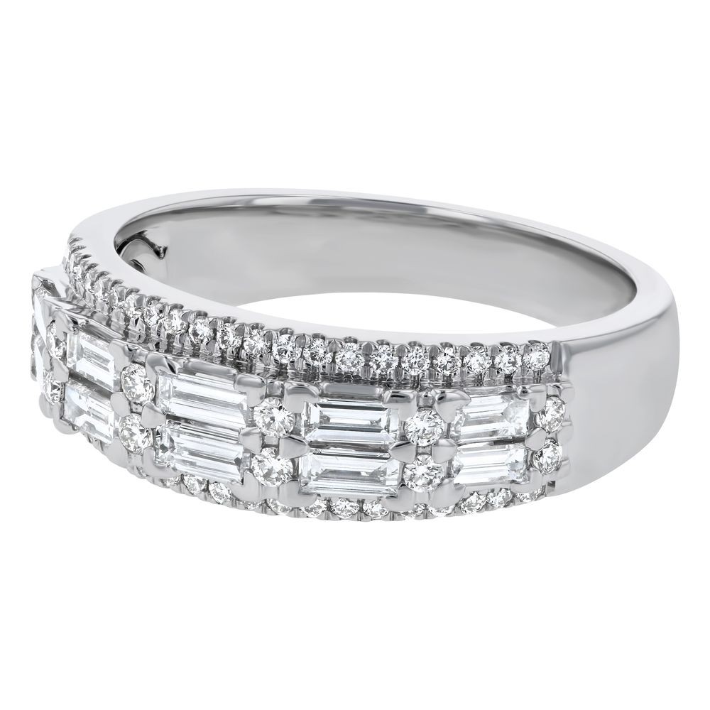 14K white gold band ring set with 0.90 carat baguette and round brilliant diamonds.