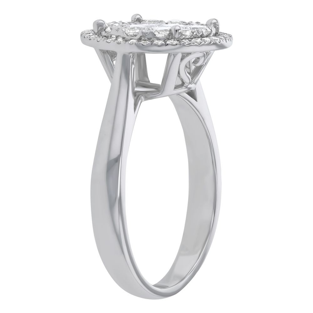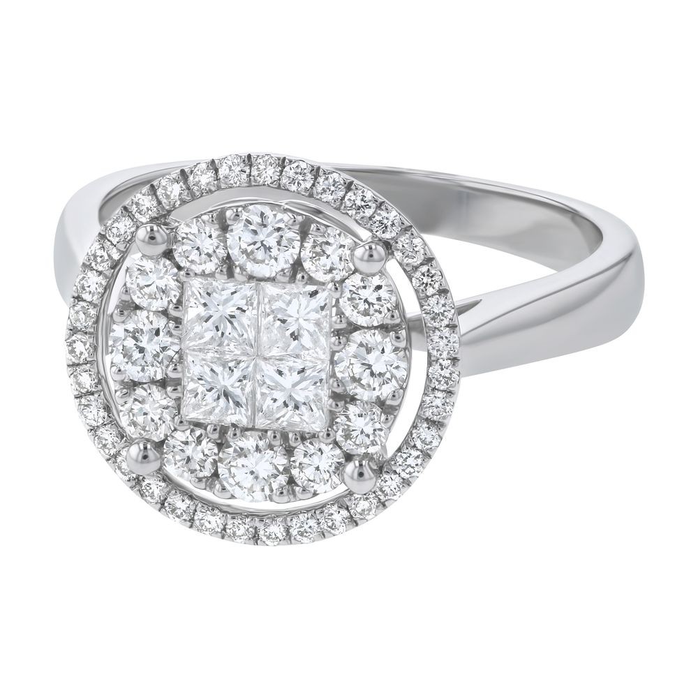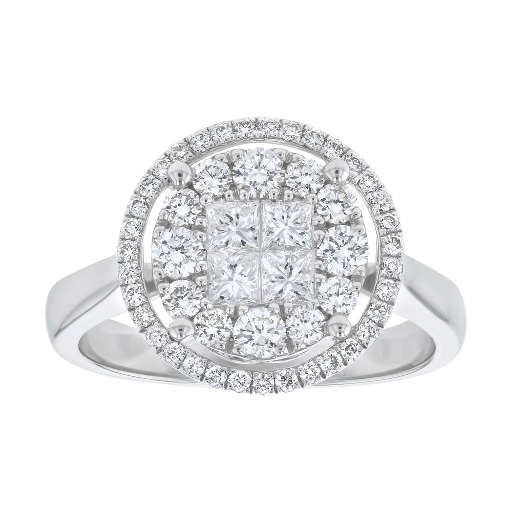 14K white gold round halo ring set with 1.0 carat of fancy cut princess and round brilliant diamonds.