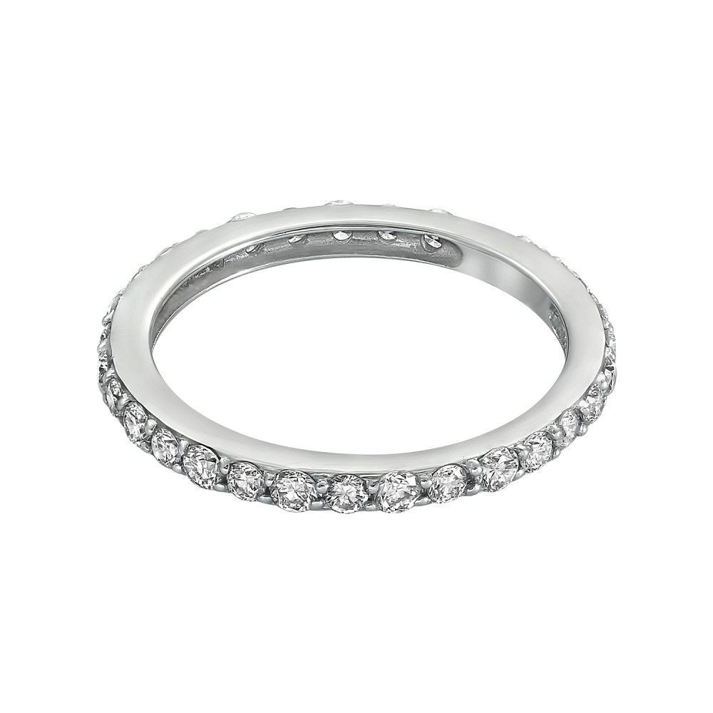 14K white gold eternity band ring prong set with 1.00 ct. round brilliant diamonds around the ring perimeter.