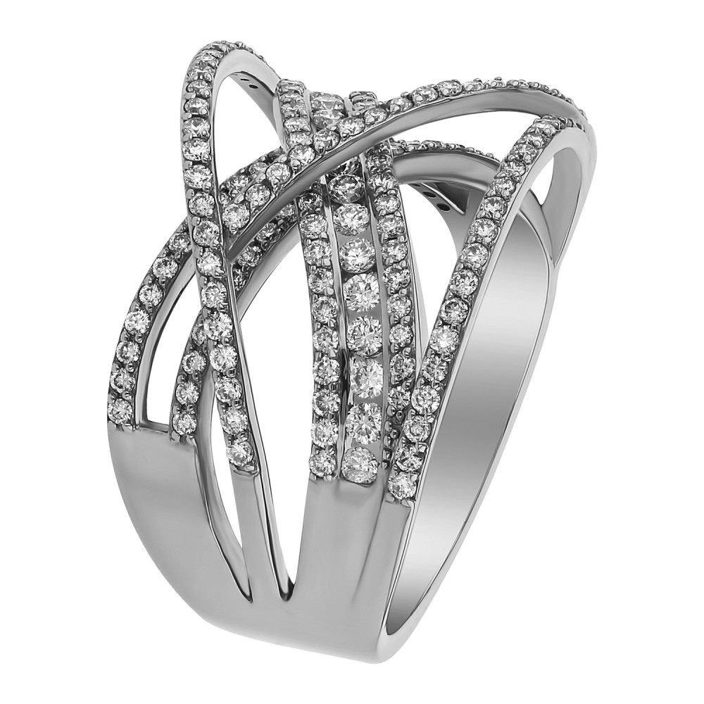 14K white gold multi row crossover fashion ring set with 1.00 carat round brilliant diamonds and high polish finish.