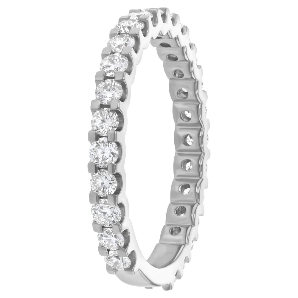 14K white gold semi eternity wedding band ring shared prongs set with 1.00 ct. round cut brilliant white diamonds and high polish finish.