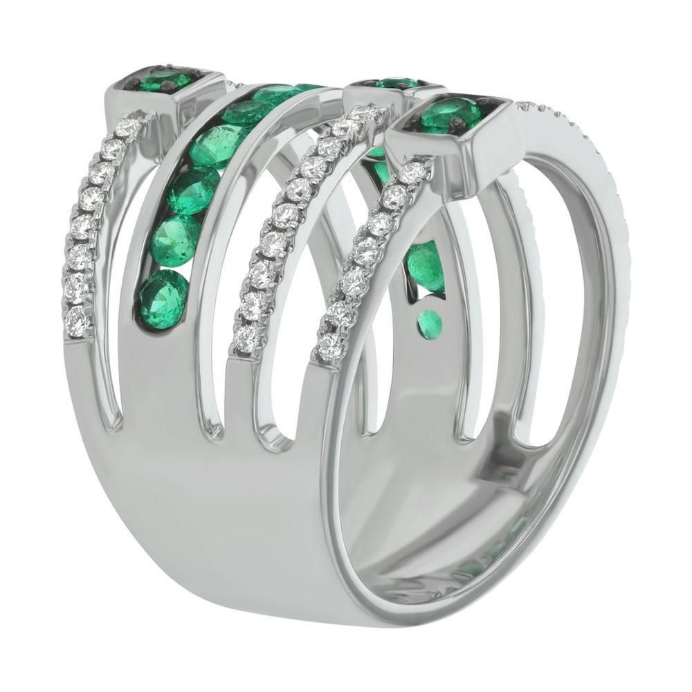 14K white gold wide multi row ring set with 0.35 carat white round diamonds and 0.75 carat emeralds.
