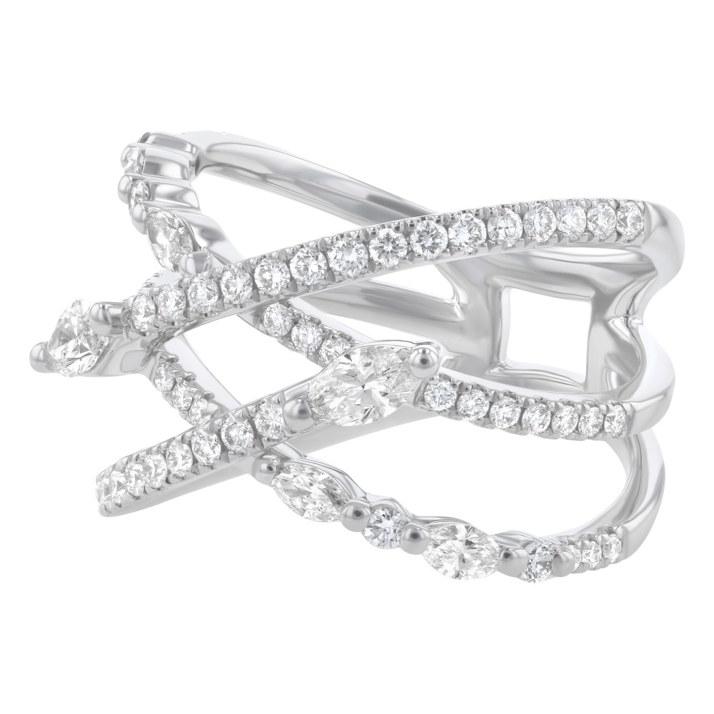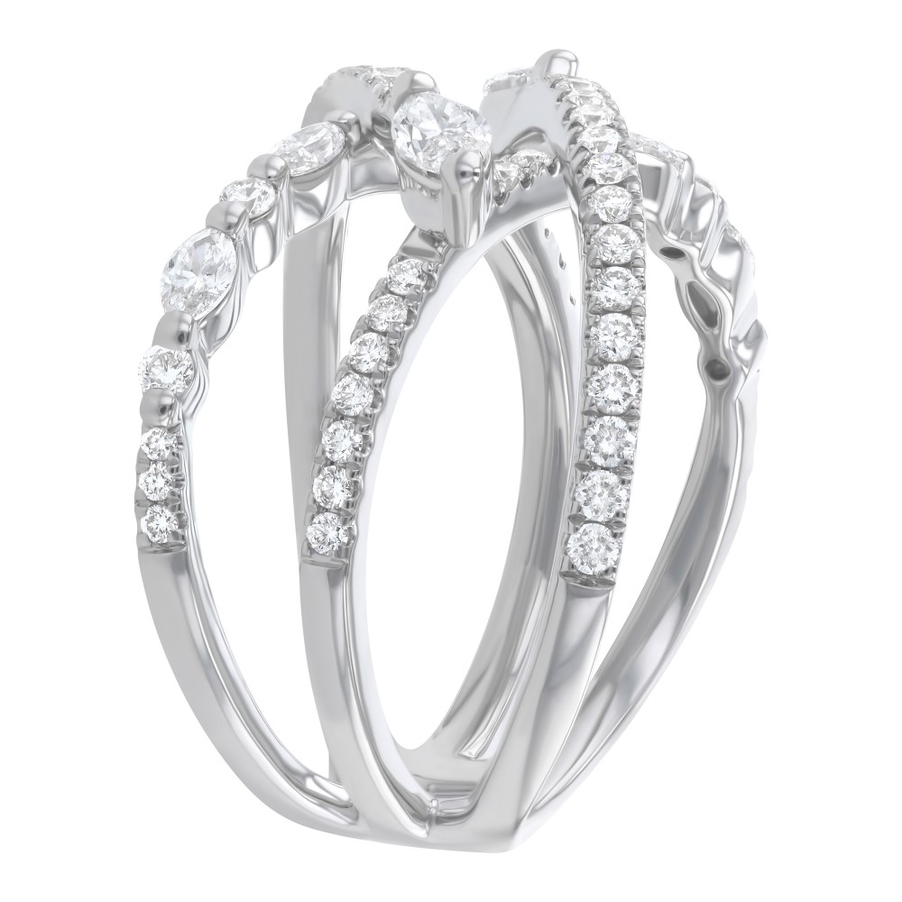 14K white gold multi row cocktail ring set with 1.10 carats marquise and round brilliant diamonds.